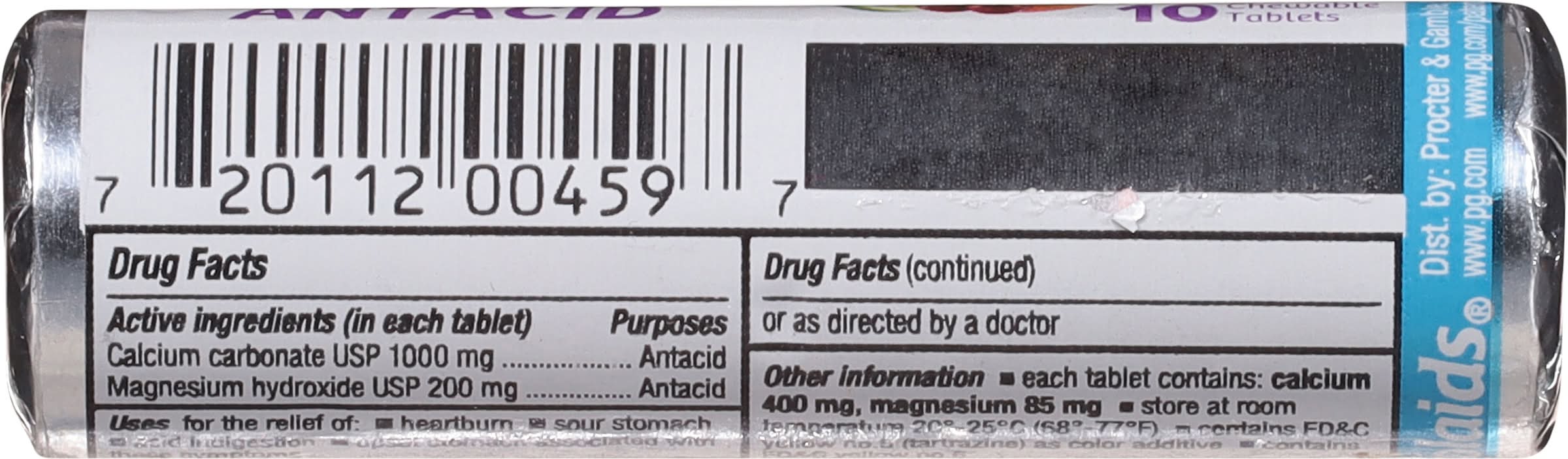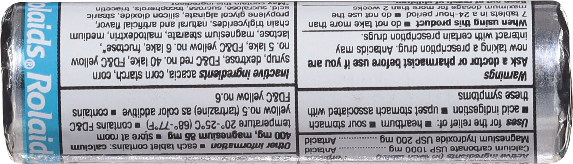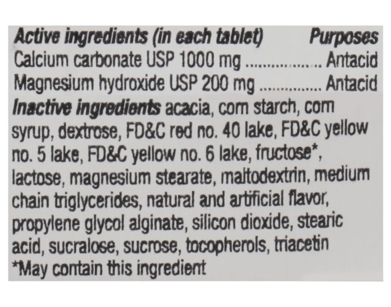 Ingredients: In Each Tablet: Active Ingredients: Calcium Carbonate (1000 mg), Antacid; Magnesium Hydroxide (200 mg), Antacid. Inactive Ingredients: Acacia, Corn Starch, Corn Syrup, Dextrose, FD&C Red No. 40 Lake, FD&C Yellow No. 5 Lake, Fructose*. *May contain this ingredient., Lactose, Magnesium Stearate, Maltodextrin, Medium Chain Triglycerides, Natural and Artificial Flavor, Propylene Glycol Alginate, Silicone Dioxide, Stearic Acid, Sucralose, Sucrose, Tocopherols, Triacetin