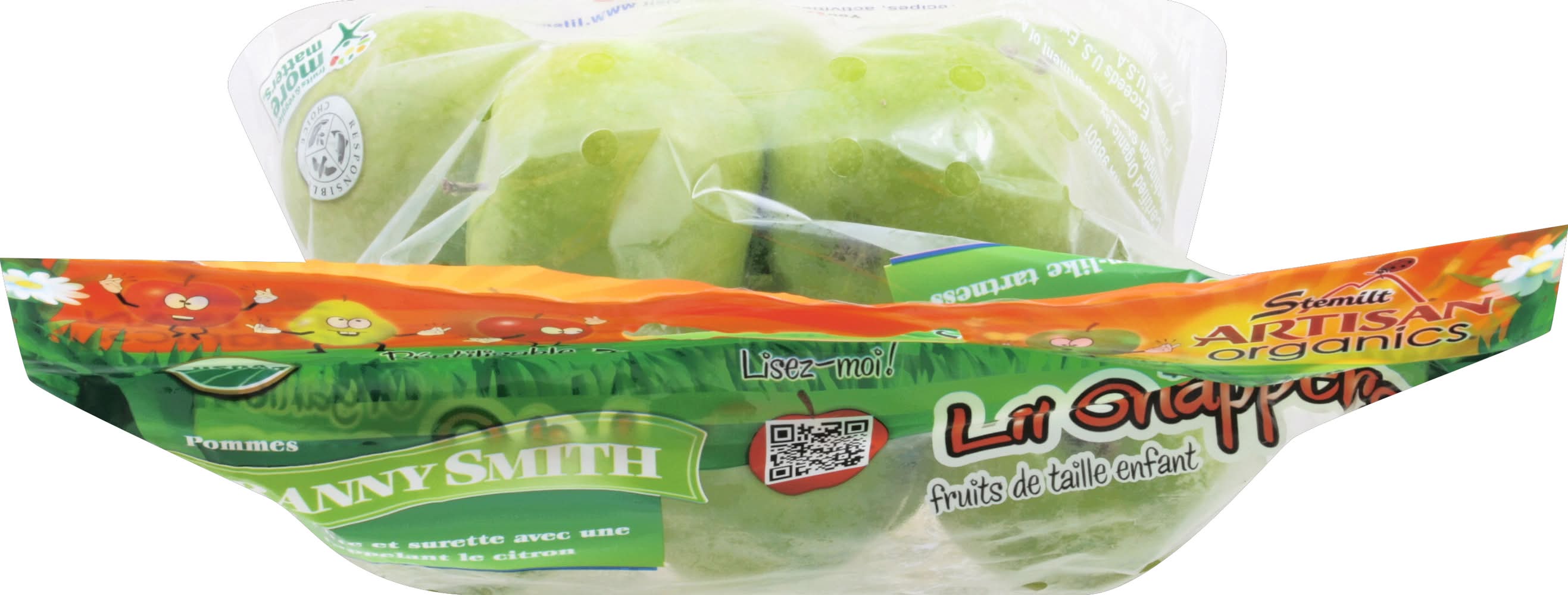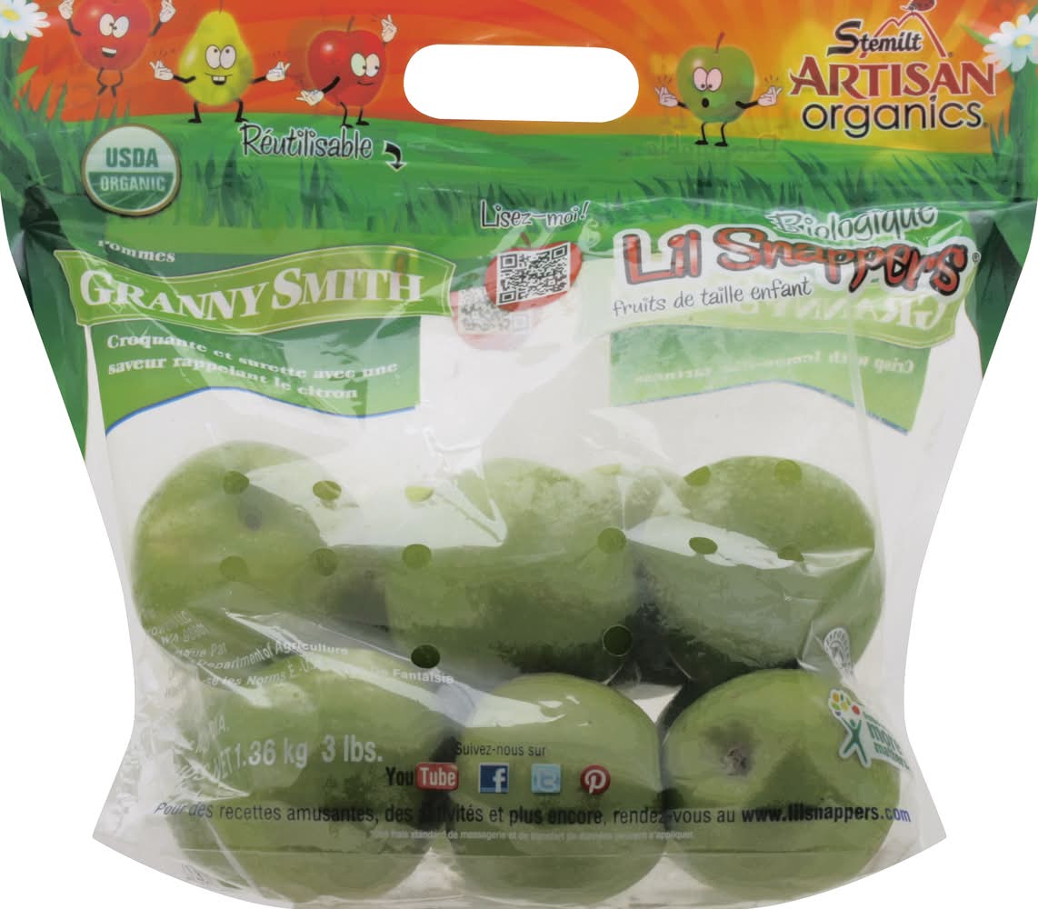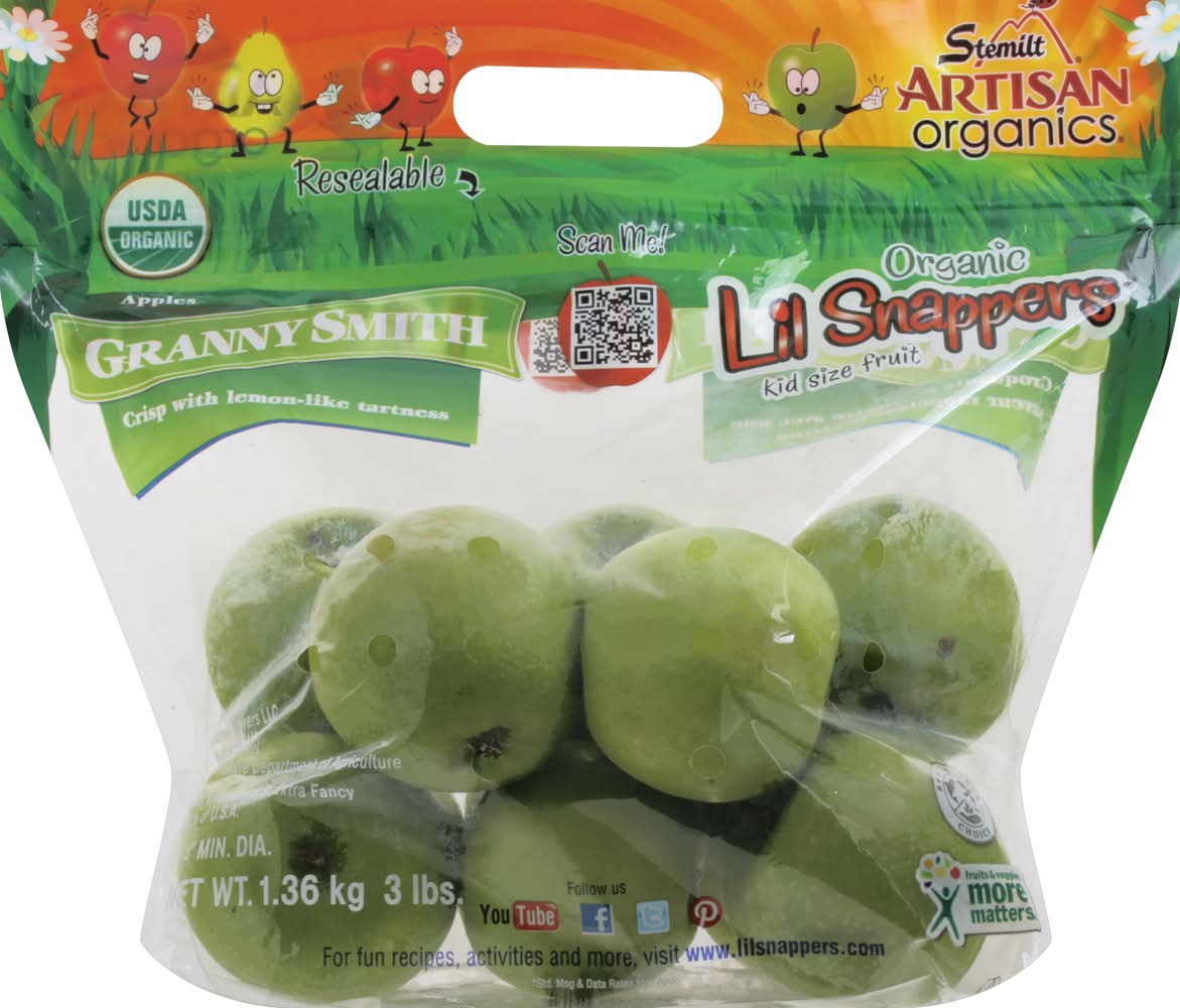 Lil Snappers Granny Smith Apples come in a three-pound package of kid-sized fruit, ideal for smaller hands and appetites. Each apple has a minimum diameter of 2-1/2 inches and offers a lemon-like tartness. They are certified organic by the Washington State Department of Agriculture and meet or exceed the US Extra Fancy standards. The apples are a responsible choice and are grown in the USA. The packaging is resealable, allowing for prolonged freshness. STEMILT GROWERS,