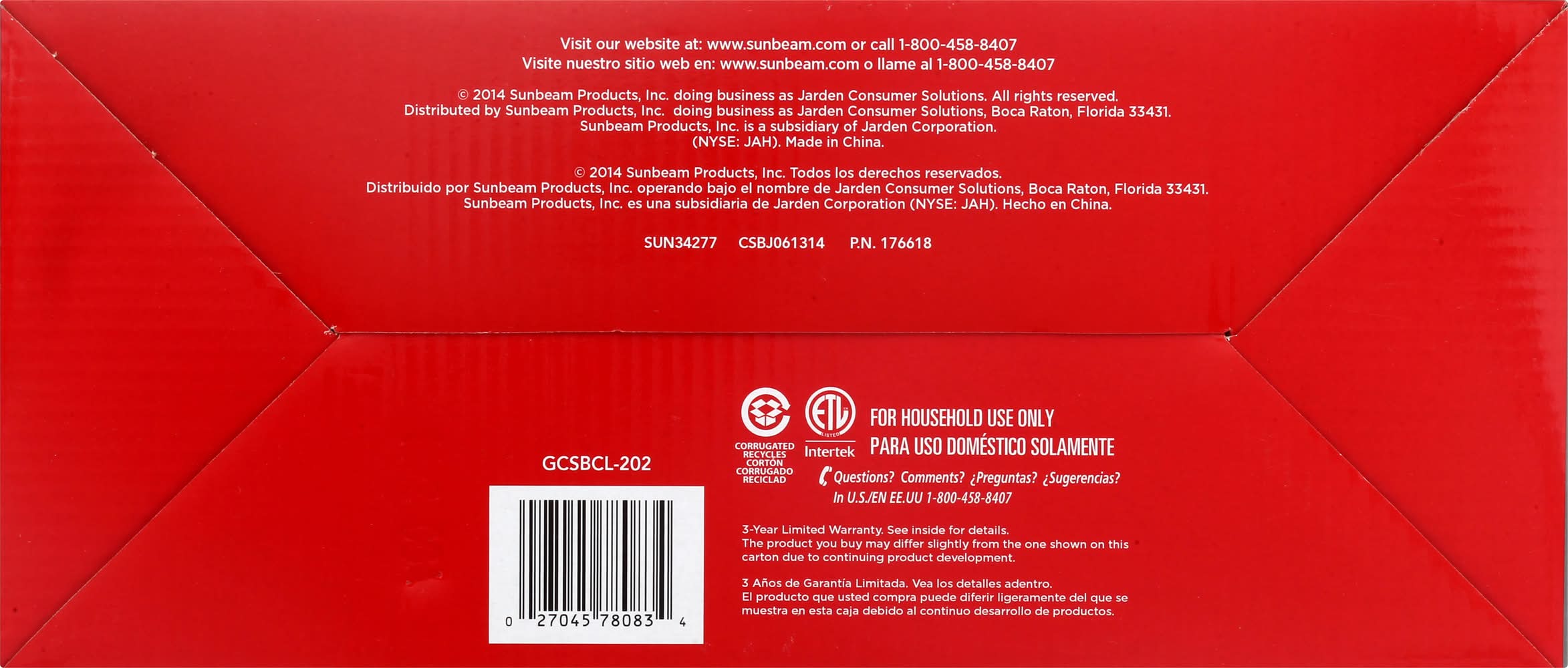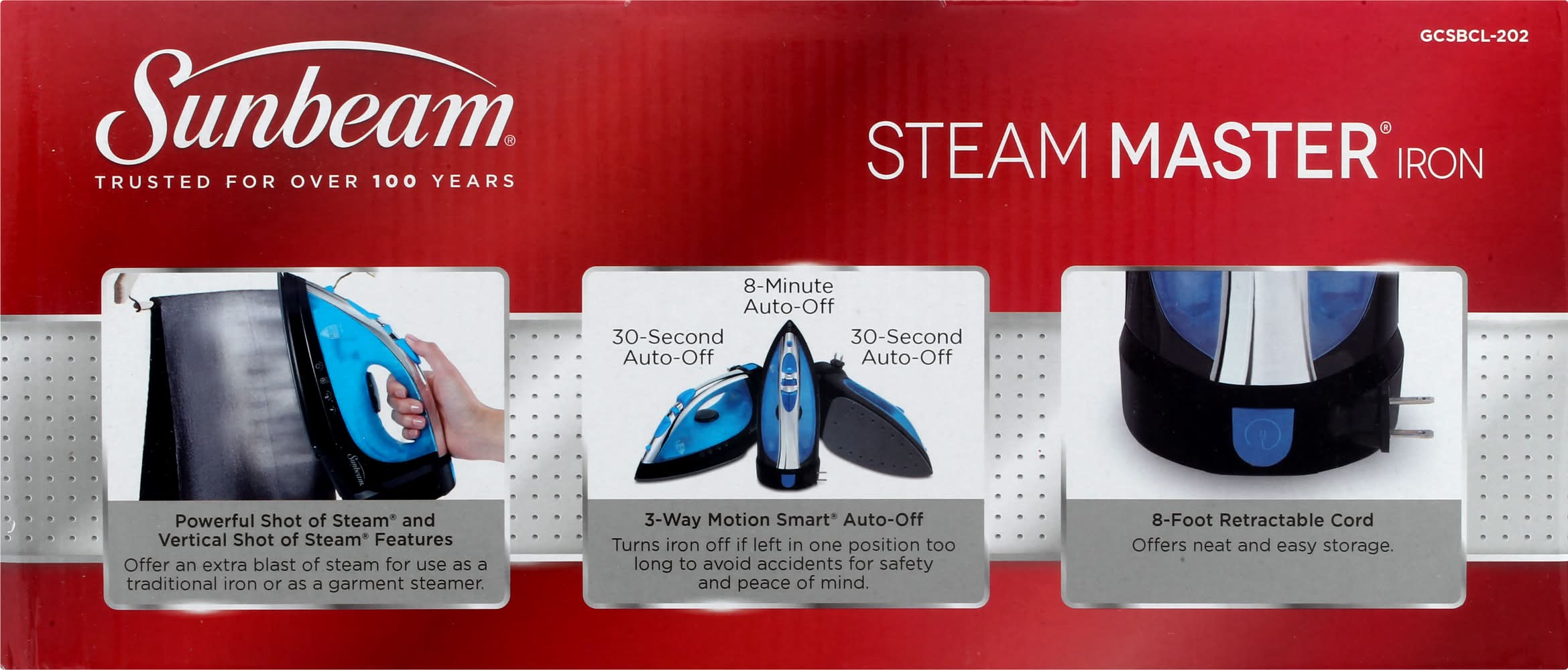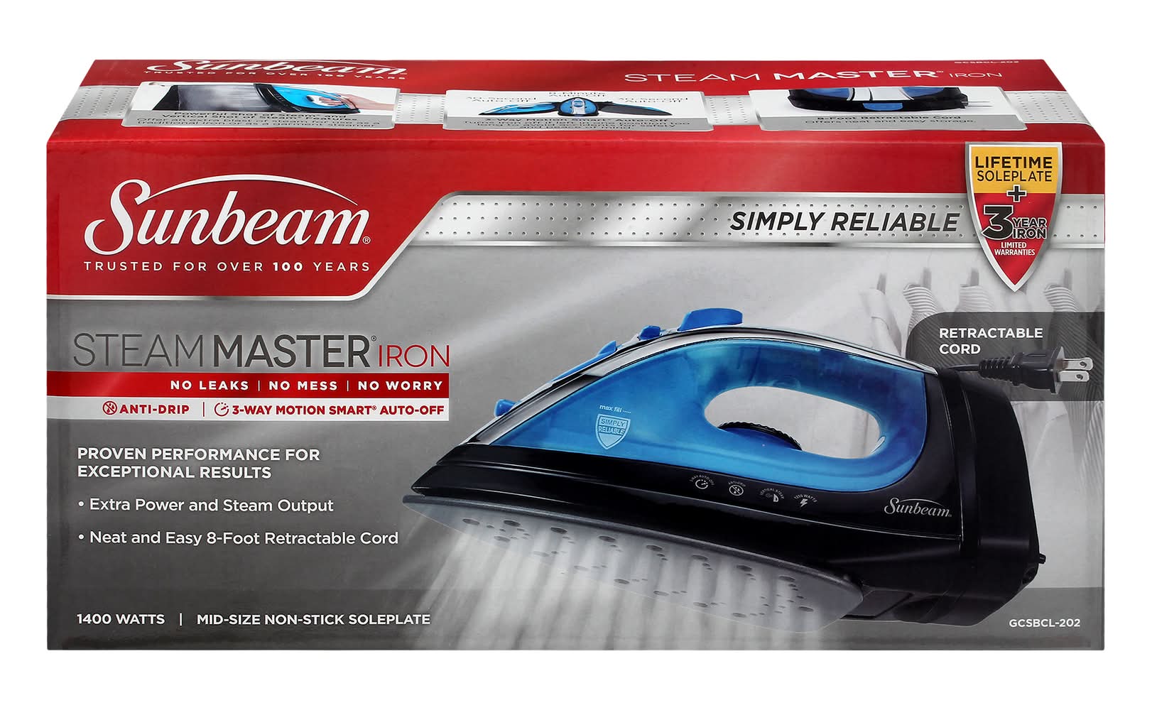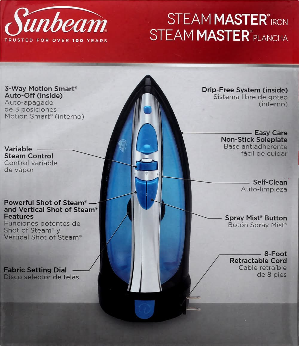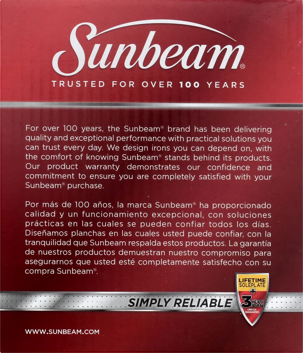14400 watts / Mid-size non-stick soleplate. Max fill. Simply reliable. Retractable cord. Steam Master Iron. No leaks. No mess. No worry. Anti-drip. 3-Way motion smart auto-off. Proven performance for exceptional results. Extra power and steam output. Neat and easy 8-foot retractable cord. Sunbeam trusted for over 100 years. For over 100 years, the Sunbeam brand has been delivering quality and exceptional performance with practical solutions you can trust every day. We design irons you can depend on, with the comfort of knowing Sunbeam stands behind its products. Our product warranty demonstrates our confidence and commitment to ensure you are completely satisfied with your Sunbeam purchase. 8-minute auto-off. 30-second auto-off. 30-second auto-off. 3-Way motion smart auto-off (inside) turns iron off i left in one position too long to avoid accidents for safety and peace of mind. Variable steam control. Powerful shot of steam and vertical shot of steam features offer an extra blast of steam for use as a traditional iron or as a garment steamer. Fabric setting dial. Drip free system (inside). Easy care non-stick soleplate. Self-clean. Spray mist button. 8-foot retractable cord offers neat and easy storage. (NYSE: JAH). The product you buy may differ slightly from the one shown on this carton due to continuing product development. Lifetime soleplate 3+ year iron limited warranties. See inside for details. ETL listed. Intertek. www.sunbeam.com. Visit our website at: www.sunbeam.com or call 1-800-458-8407. Questions? Comments? In US 1-800-458-8407. Corrugated recycles corton. Made in China. Sunbeam Products Inc.,