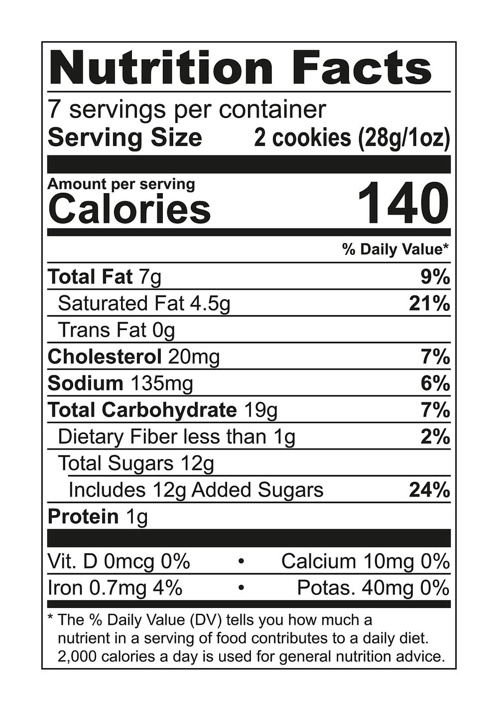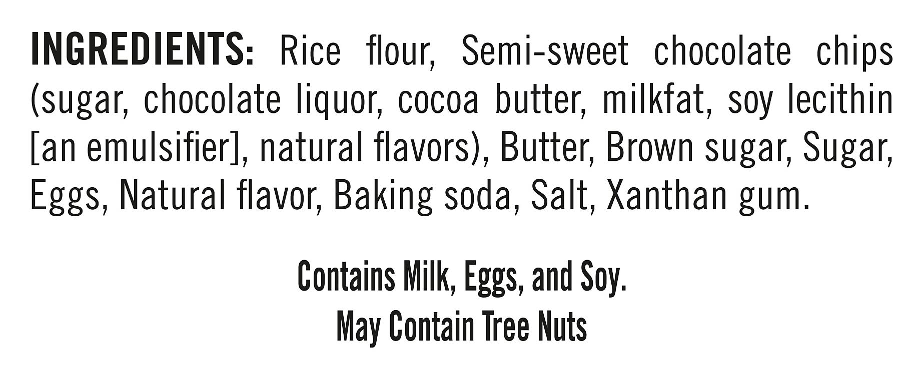 Ingredients: INGREDIENTS: Rice flour, Semi-sweet chocolate chips (sugar, chocolate liquor, cocoa butter, milkfat, soy lecithin [an emulsifier], natural flavors), Butter, Brown sugar, Sugar, Eggs, Natural flavor, Baking Soda, Salt, Xanthan gum. Contains Milk, Eggs and Soy. May contain tree nuts. Contains: Contains Milk, Eggs and Soy. May contain tree nuts.
