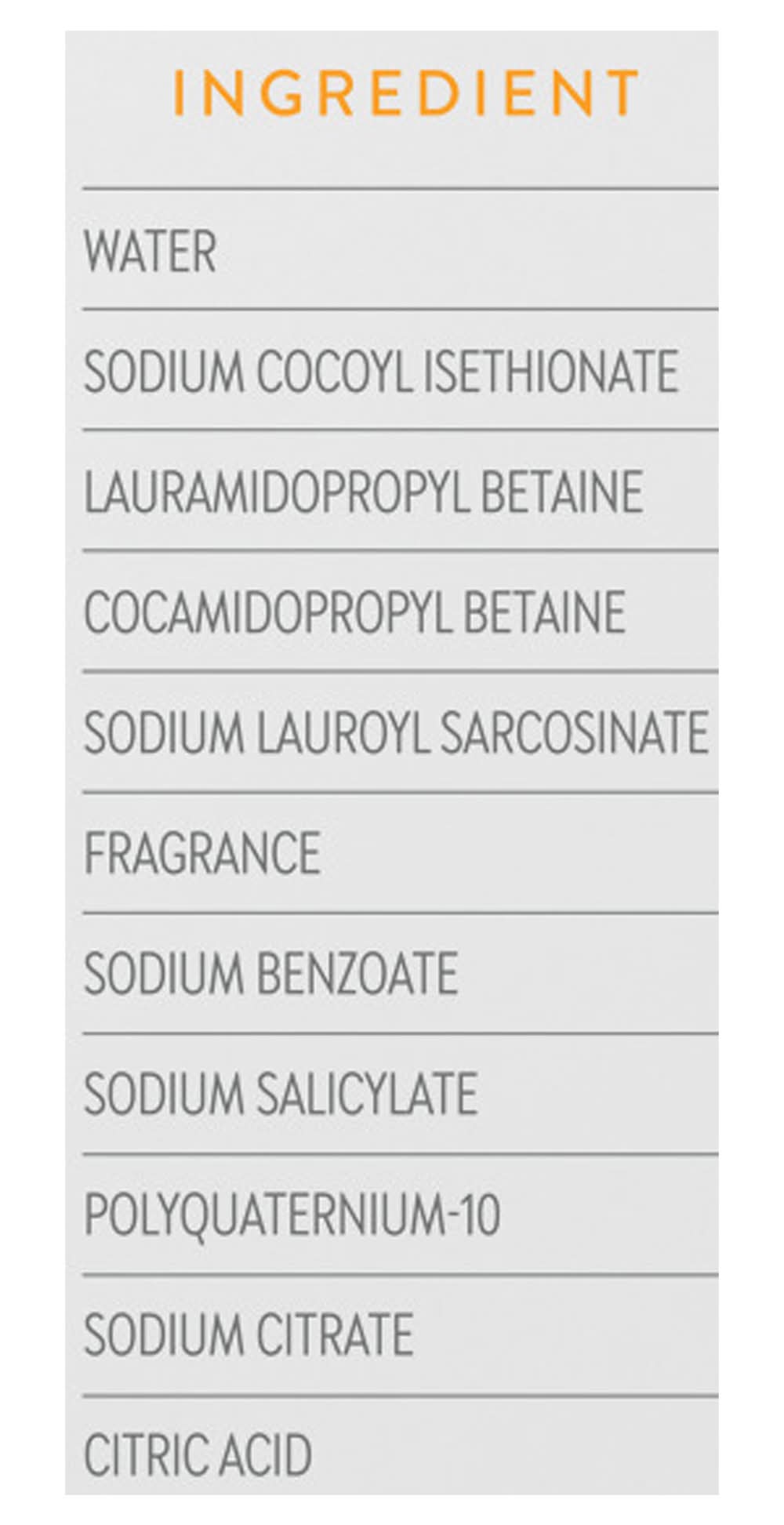Ingredients: Water, Sodium Cocoyl Isethionate, Lauramidopropyl Betaine, Cocamidopropyl Betaine, Sodium Lauroyl Sarcosinate, Fragrance, Sodium Benzoate, Sodium Salicylate, Polyquaternium-10, Sodium Citrate, Citric Acid
