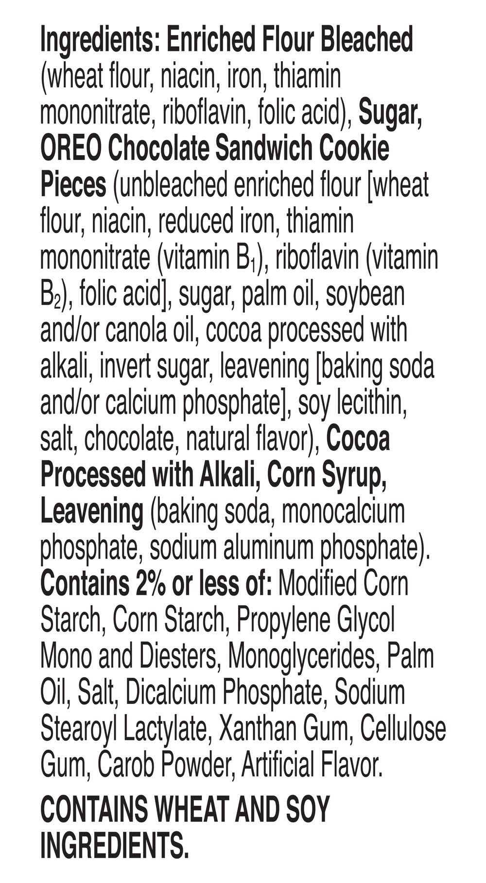 Ingredients: Enriched Flour Bleached (Wheat Flour, Niacin, Iron, Thiamin Mononitrate, Riboflavin, Folic Acid), Sugar, Oreo Chocolate Sandwich Cookie Pieces (Unbleached Enriched Flour [Wheat Flour, Niacin, Reduced Iron, Thiamin Mononitrate (Vitamin B1), Riboflavin (Vitamin B2), Folic Acid], Sugar, Palm Oil, Soybean and/or Canola Oil, Cocoa Processed with Alkali, Invert Sugar, Leavening [Baking Soda and/or Calcium Phosphate], Soy Lecithin, Salt, Chocolate, Natural Flavor), Cocoa Processed with Alkali, Corn Syrup, Leavening (Baking Soda, Monocalcium Phosphate, Sodium Aluminum Phosphate). Contains 2% or Less of: Modified Corn Starch, Corn Starch, Propylene Glycol Mono and Diesters, Monoglycerides, Palm Oil, Salt, Dicalcium Phosphate, Sodium Stearoyl Lactylate, Xanthan Gum, Cellulose Gum, Carob Powder, Artificial Flavor Contains: Wheat, Soybeans Additives: Genetically Modified Ingredients