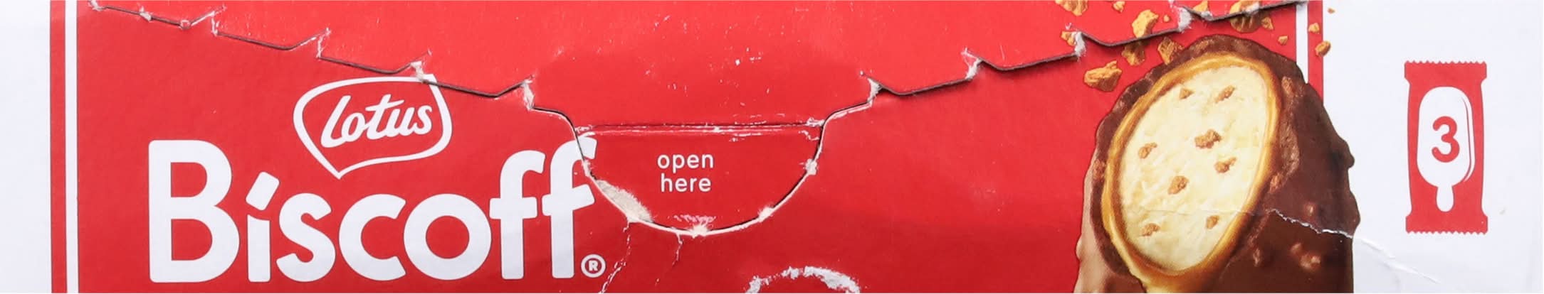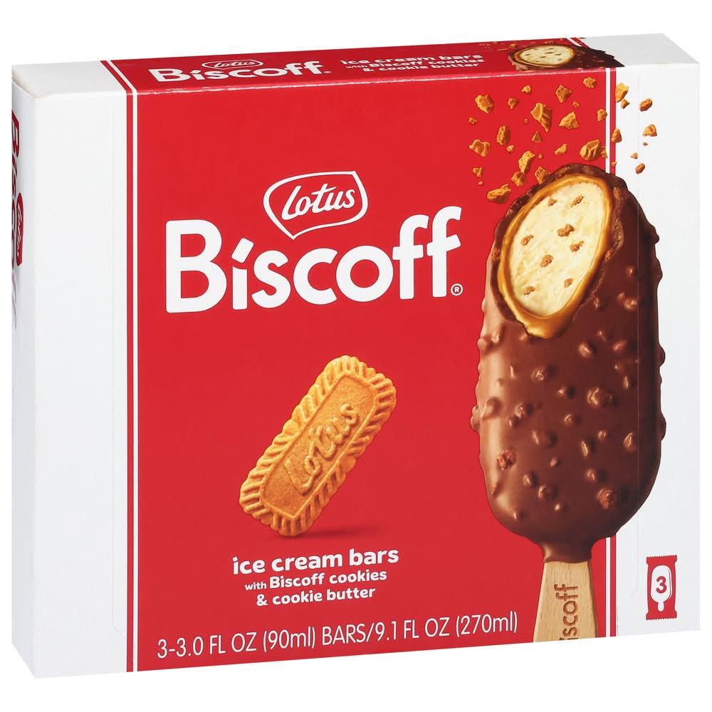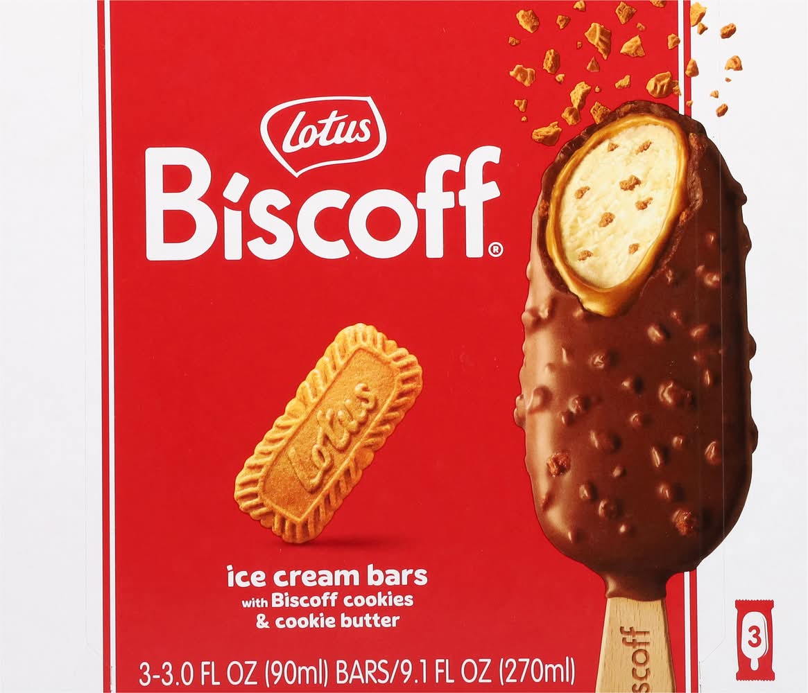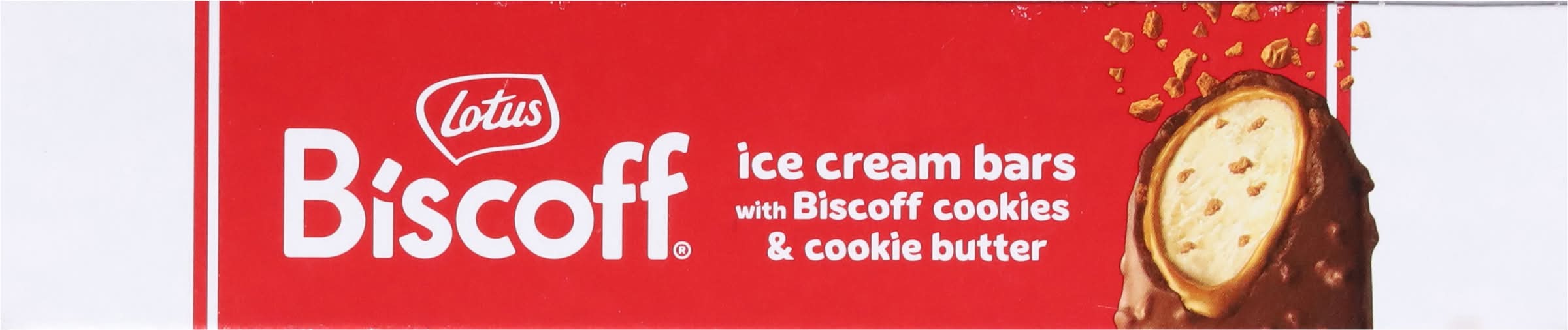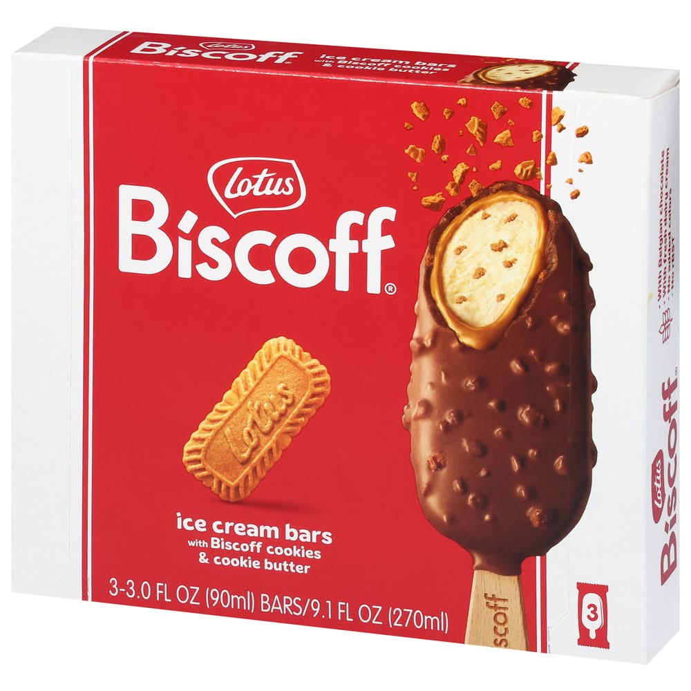 Ice cream bars with biscoff cookies & cookie butter. Delight in every bite! Enjoy the delicious caramelized taste of Biscoff with every bite of our irresistible Biscoff ice cream. This treat is made from velvety Biscoff dairy ice cream, covered in a rich layer of Biscoff cookie butter, and coated in Belgian milk chocolate with crunchy Biscoff cookie pieces. Enjoy on a hot summer's day, as an afternoon treat, or as a surprising dessert. Biscoff ice cream with Biscoff cookie bits, dipped in Biscoff cookie butter and Belgian milk chocolate coating with Biscoff cookie bits. No added colors. • Pack size: 3 • Lotus Bakeries North America, 1000 Sansome St,Suite 220,San Francisco,CA,94111