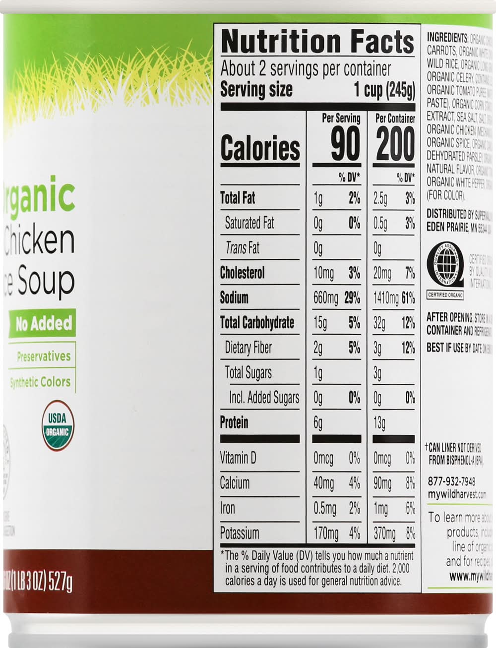 Ingredients: Organic Chicken Stock, Organic Carrots, Organic White Chicken Meat, Organic Wild Rice, Organic Long Grain Brown Rice, Organic Celery, Contains Less That 2% of: Organic Tomato Puree (Water, Organic Tomato Paste), Organic Corn Starch, Organic Yeast Extract, Sea Salt, Salt, Organic Chicken Fat, Organic Chicken (Mechanically Deboned), Organic Spice, Organic Canola Oil, Organic Dehydrated Parsley, Organic Rice Flour, Natural Flavor, Organic Tomato Paste, Organic White Pepper, Organic Turmeric (for Color).
