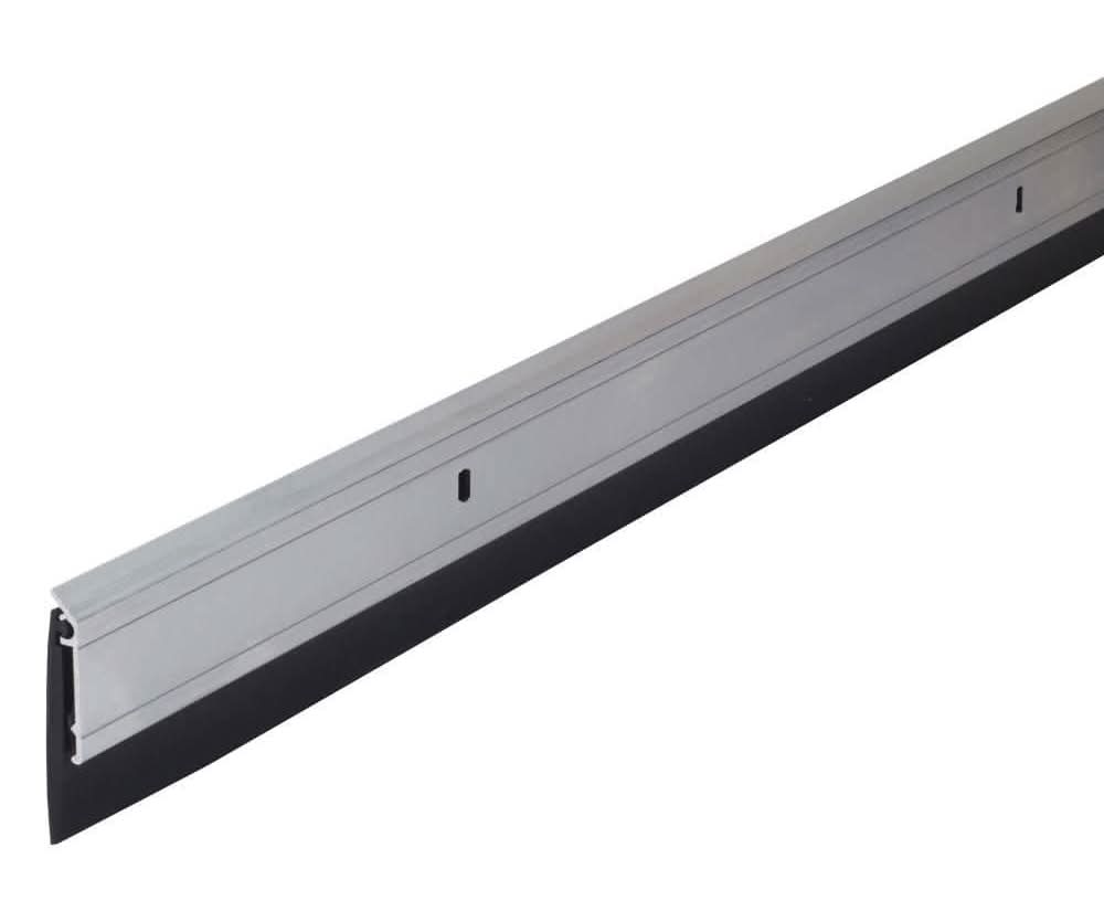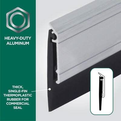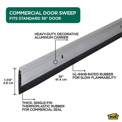 The M-D Aluminum and Thermoplastic Rubber Commercial Screw-on Door Sweep features a thermoplastic rubber seal for protection from drafts, moisture, dust and insects. The rubber seal has higher durability and sealing properties than standard vinyl. It is UL Rated for slower flammability to limit the spread of fire in a building. Save on energy by sealing the bottom of the door and keeping the heat or air conditioning from escaping. All of the hardware needed to install is included. Before installation, cut to desired length by using a hacksaw. • Color: Silver • Size: 36 in