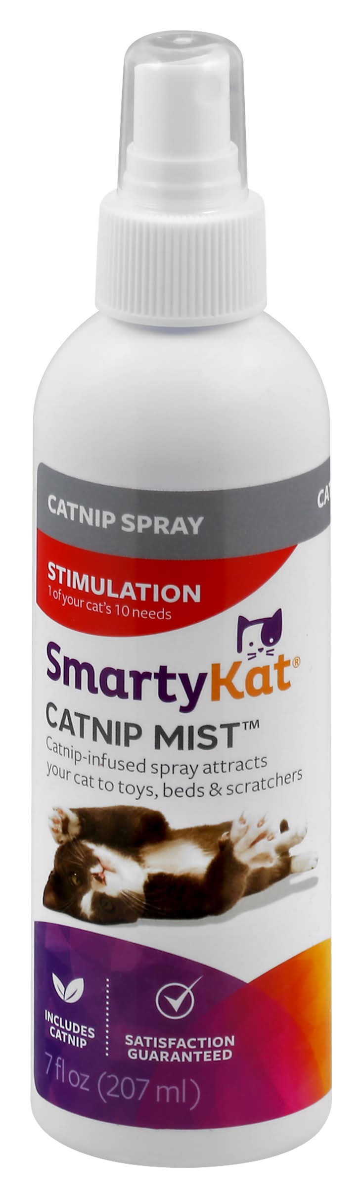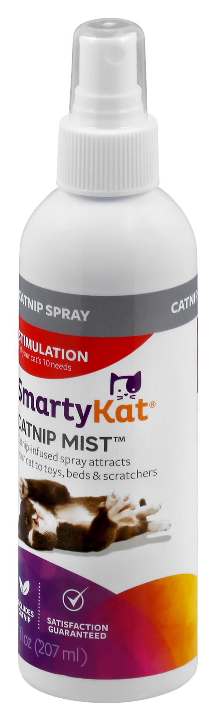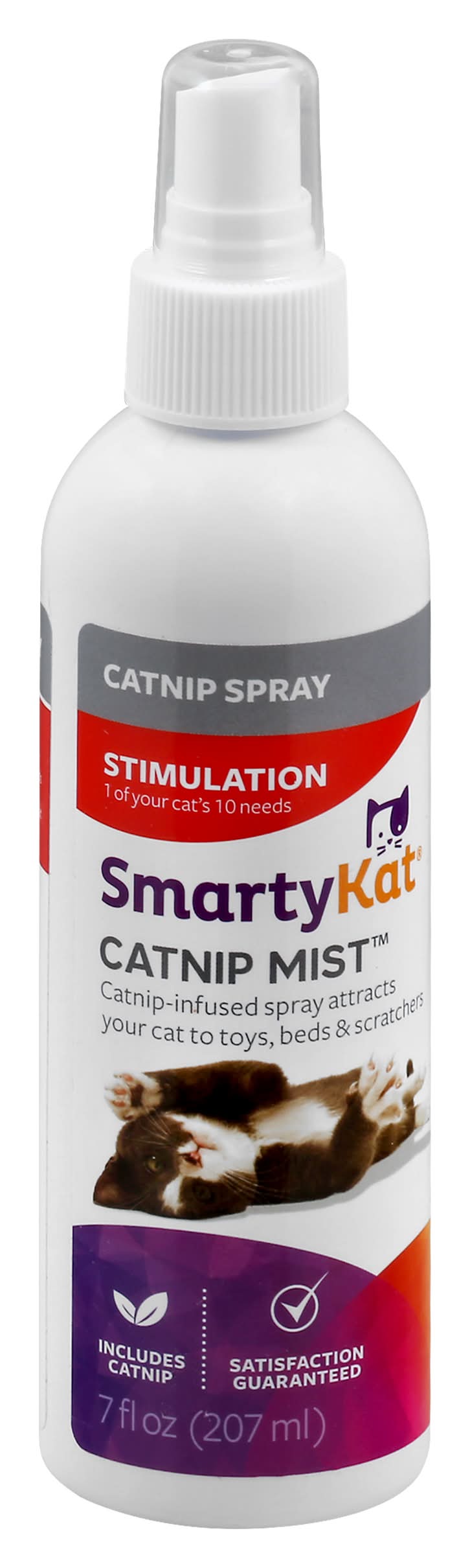 Stimulation 1 of your cat's 10 needs. Catnip-infused spray attracts your cat to toys, beds & scratchers. Includes catnip. Complete Needs System Hunt, care, interaction comfort, independence, exercise, scratch, stimulation, privacy, explore. Stimulation this spray helps meet cats' need for stimulation. Use the Complete Needs System to find products that satisfy your cat's other needs. Eco Advantages Made with natural catnip oil. Safer For Pets SmartKat products are designed to meet child safety standards - eliminating small parts, long cords & other hazards - to ensure they're safer. Satisfaction guaranteed. Packaging: Reusable