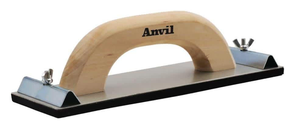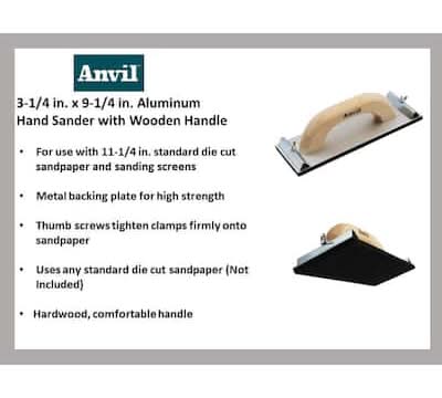 This Anvil drywall hand sander is a popular sander with a comfortable hardwood handle. Metal backing plate for high strength. Beautifully balanced, this clamp style sander is now easier to use. Thumb screws tighten clamps firmly onto sandpaper. Uses any standard die cut sandpaper. The pad dimension: 9-1/4 in. x 3-1/4 in. Size: 3-1/4 X 9-1/4 In