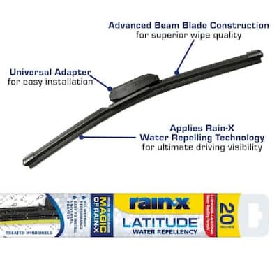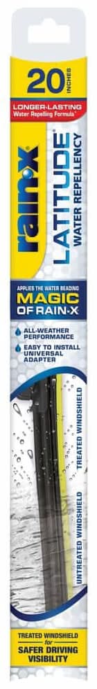 Outsmart the Elements with Rain-X! No other wipers deliver the innovation and technology that is offered by Rain-X Latitude Water Repellency Wiper Blades. These unique blades apply new Rain-X water-repellent technology directly to your windshield, which now lasts longer than ever! The water-repellent transfers from the squeegee to the glass - and the magic of Rain-X is activated! Rain-X Latitude Water Repellency Wiper Blades feature advanced beam technology designed to hug your windshield for maximum contact and superior wipe quality. These 2-in-1 wiper blades both clear and repel the elements to provide enhanced driving visibility. Compared to traditional wiper blades, the difference is amazing! For optimal water repellency activation, run your wiper blades on a clean, wet, or dry windshield for 2 minutes. Once activated, the water-repelling action will last for the life of the blade. Size: 20 in