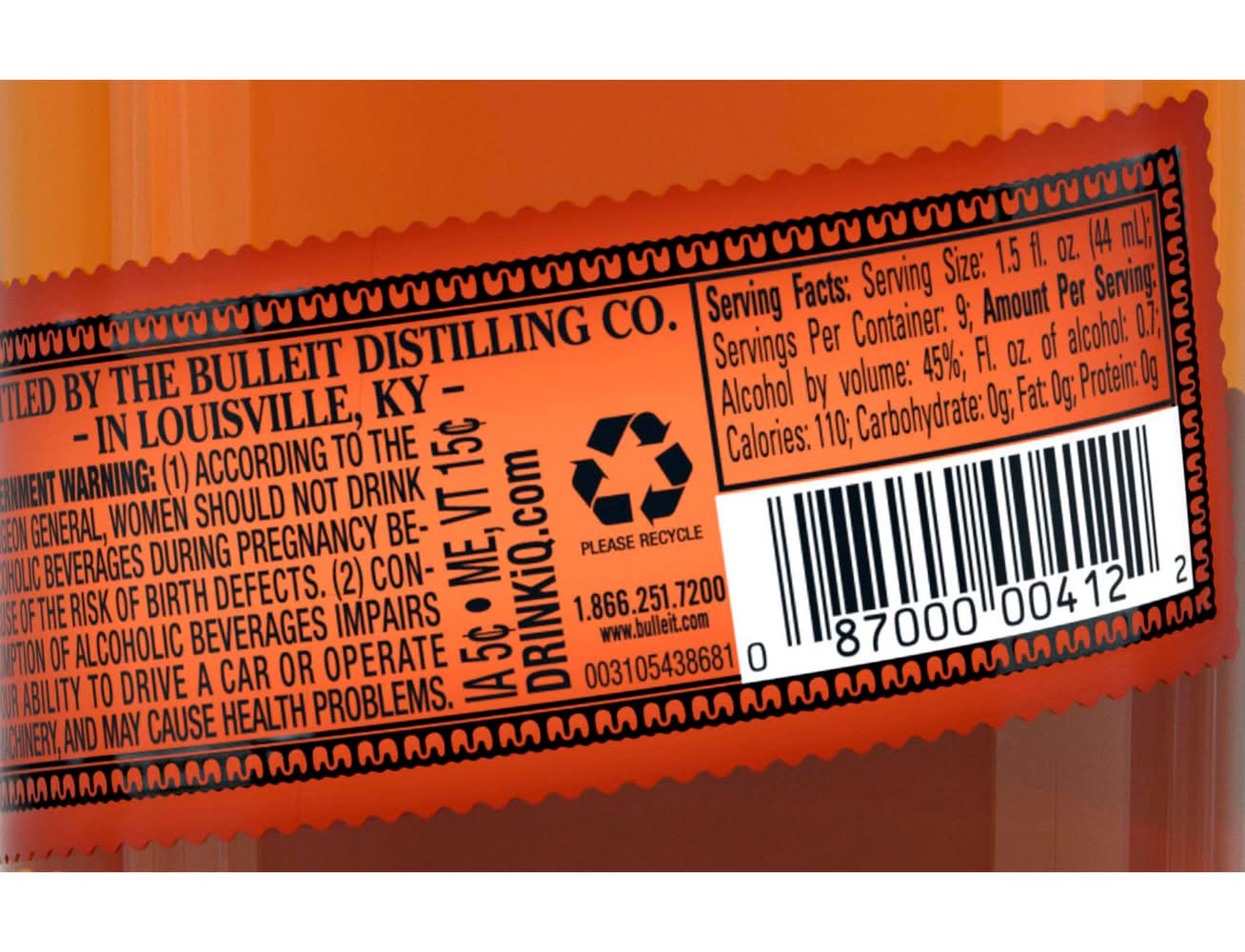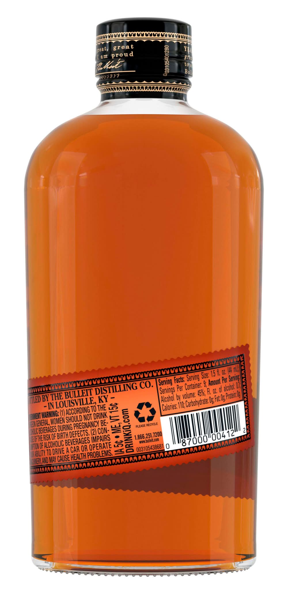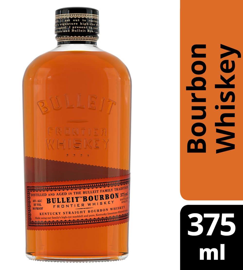 Bulleit Bourbon is inspired by the whiskey that was pioneered over 150 years ago. Only ingredients of the very highest quality are used. The complexity of Bulleit Bourbon comes from its unique blend of rye, corn, and barley malt, along with special strains of yeast and pure Kentucky limestone filtered water. Due to its especially high rye content, Bulleit Bourbon has a bold, spicy character with a finish that's distinctively clean and smooth. Medium amber in color, with gentle spiciness and sweet oak aromas, the mid-palate is smooth with tones of maple, oak, and nutmeg. The finish is long, dry, and satiny with a light-tasting toffee flavor that lingers long after the final sip. Bulleit Bourbon earned a Gold medal at the 2021 San Francisco World Spirits Competition. Perfect for a classic Manhattan cocktail. Includes one 90 proof 375 mL bottle of Bourbon Whiskey. Please drink responsibly. • Alcohol by volume: 45% • Diageo, • Packaging: Reusable