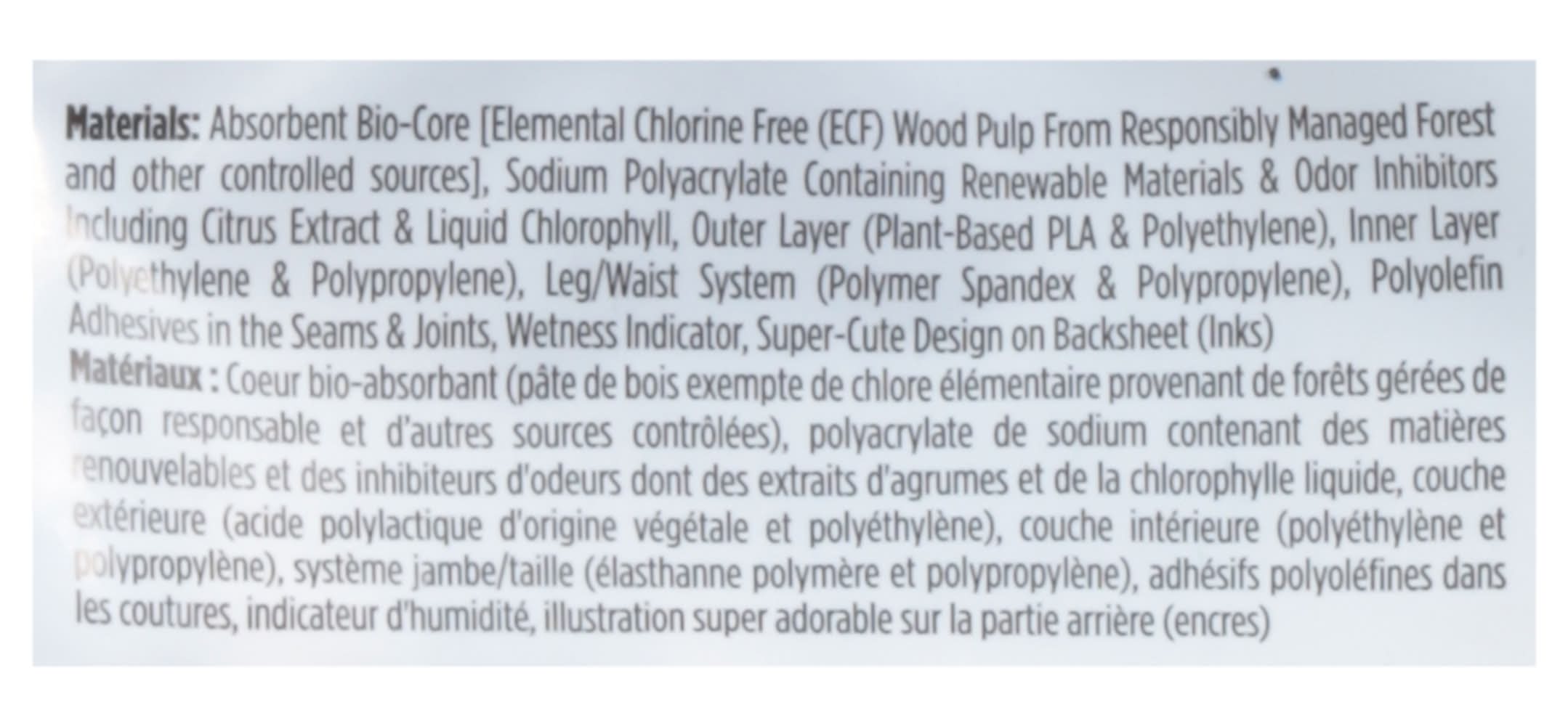 Ingredients: Materials: Absorbent Bio-Core [Elemental Chlorine Free (ECF) Wood Pulp from Responsibly Managed Forest and Other Controlled Sources], Sodium Polyacrylate Containing Renewable Materials & Odor Inhibitors Including Citrus Extract & Liquid Chlorophyll, Outer Layer (Plant-Based PLA & Polyethylene), Inner Layer (Polyethylene & Polypropylene), Leg/Waist System (Polymer Spandex & Polypropylene), Polyolefin Adhesives in the Seams & Joints, Wetness Indicator, Super-Cute Design on Backsheet (Inks)