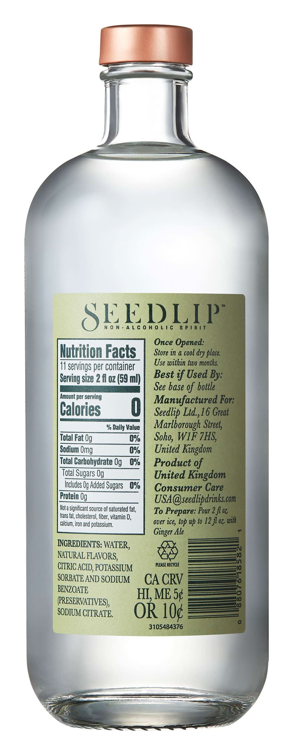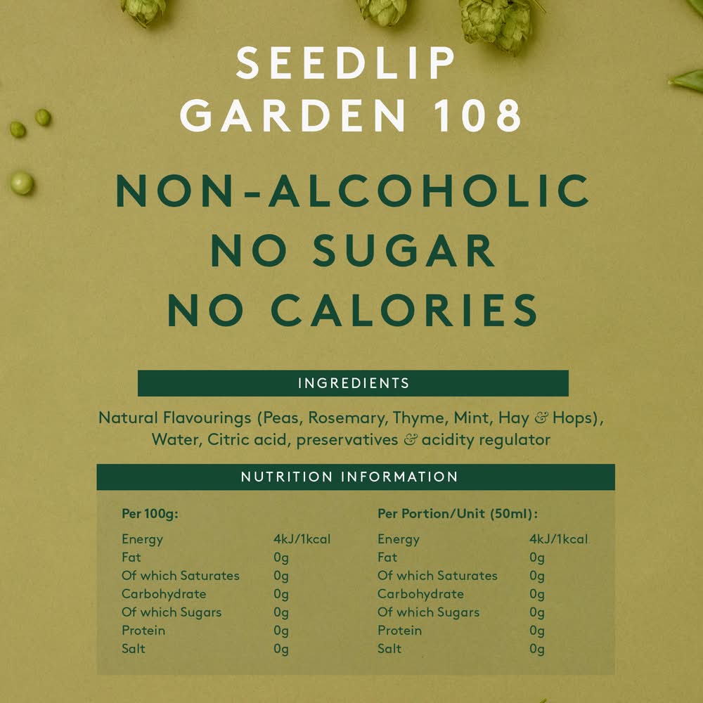 Seedlip Garden 108 Non alcoholic Spirit, 700ml (23.7 floz.) Bottle. 0% Alcohol. 1 x Bottle = 14 Drinks. High quality natural ingredients: Pea, Rosemary, Thyme, Spearmint, Hay & Hops. Perfect for any occasion when you are looking to moderate alcohol or for when you just want to drink something exceptional. Pour 2oz of Seedlip Garden 108 over ice and and mix with your favorite premium mixer. We recommend premium tonic water or citrus seltzer. Garnish with style. Seedlip can also be used in a range of alcohol free cocktails such as Martinis and Mojitos. All Seedlip Non-alcoholic Spirits can be consumed during pregnancy. Made in the United Kingdom.