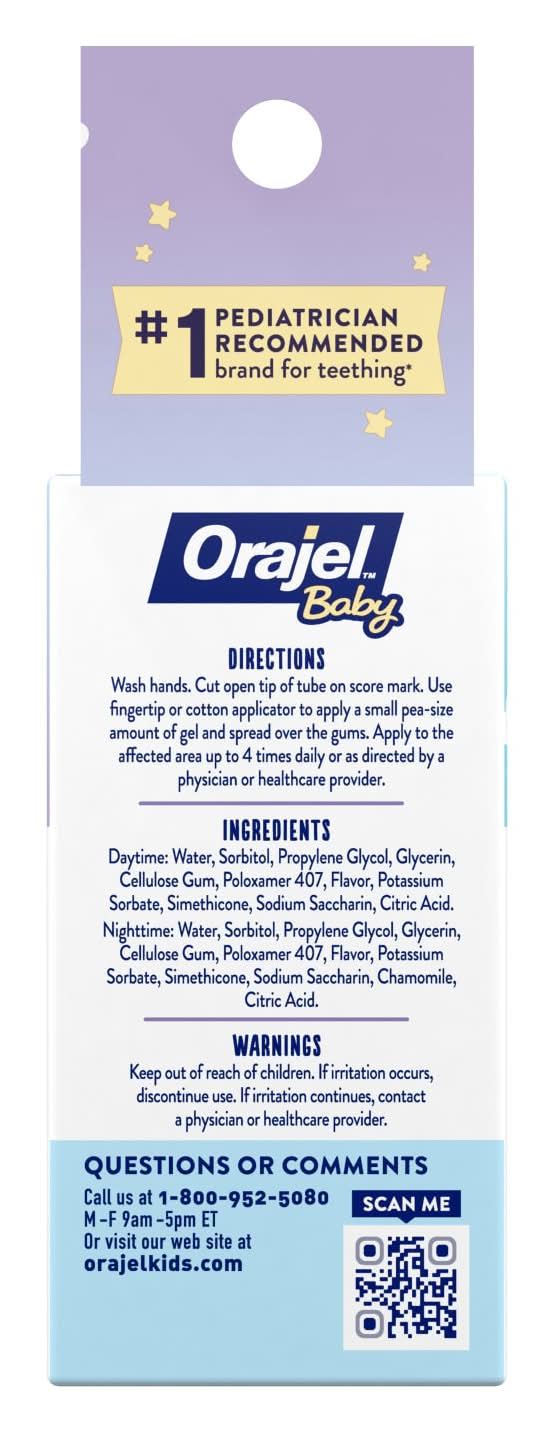 will help soothe infants who may be teething, upset, cranky or benzocaine-free tubes with one daytime and one nighttime flavored formula that provide an instant cooling sensation. Use the daytime formula at home or on-the go and the nighttime formula with chamomile at bedtime. Safe and gentle, Oriel is the Pediatrician Recommended Brand for Teething. When it’s time to move on to fluoride-free training toothpaste and independent brushing, Oriel has you covered from first tooth to full smile. among those who recommend a brand • Church & Dwight Co., Inc., Ewing,NJ,08628 • Packaging: Reusable