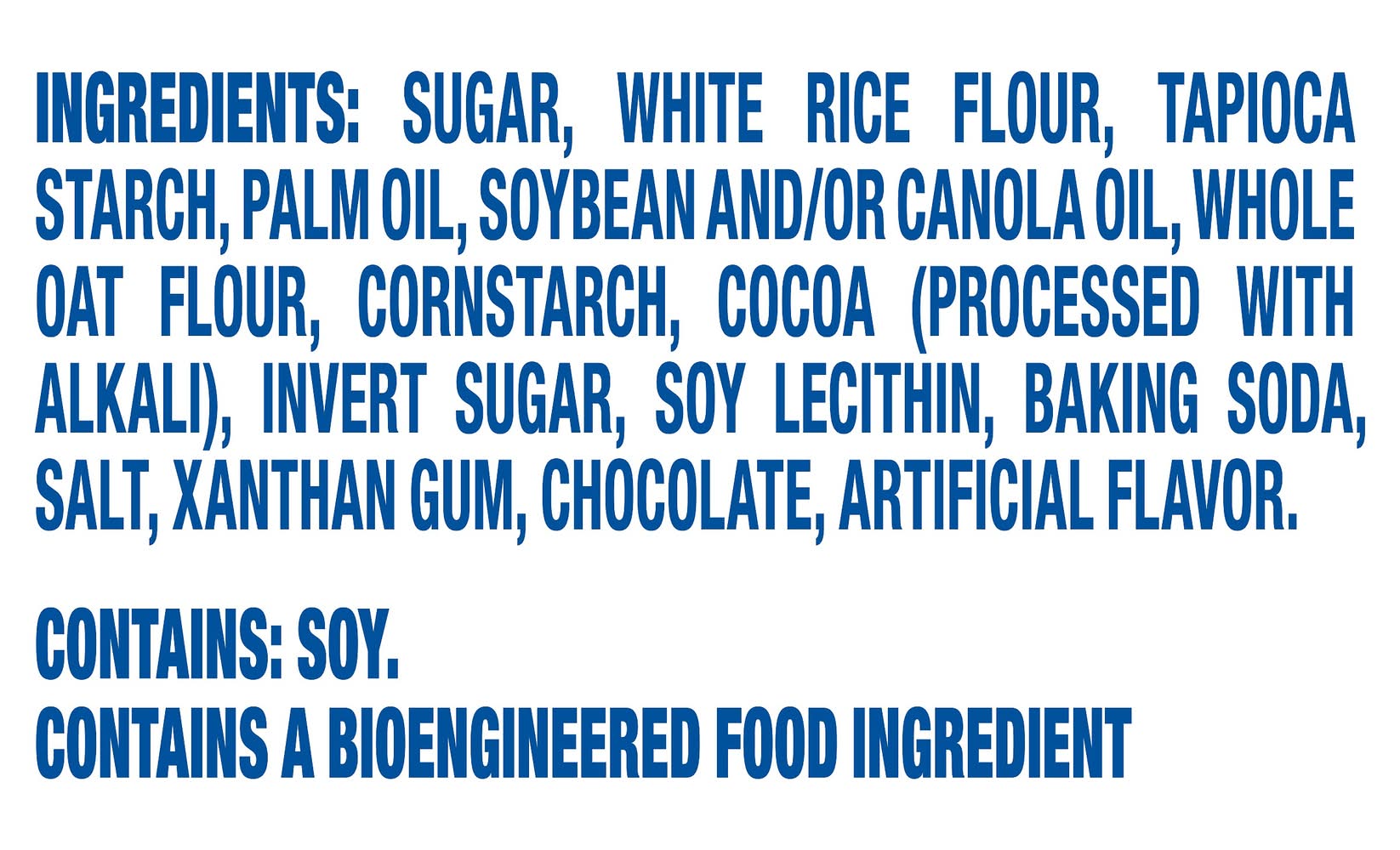 Ingredients: INGREDIENTS: SUGAR, WHITE RICE FLOUR, TAPIOCA STARCH, PALM OIL, SOYBEAN AND, OR CANOLA OIL, WHOLE OAT FLOUR, CORNSTARCH, COCOA (PROCESSED WITH ALKALI), INVERT SUGAR, SOY LECITHIN, BAKING SODA, SALT, XANTHAN GUM, CHOCOLATE, ARTIFICIAL FLAVOR.CONTAINS: SOY. Contains: CONTAINS: SOY.