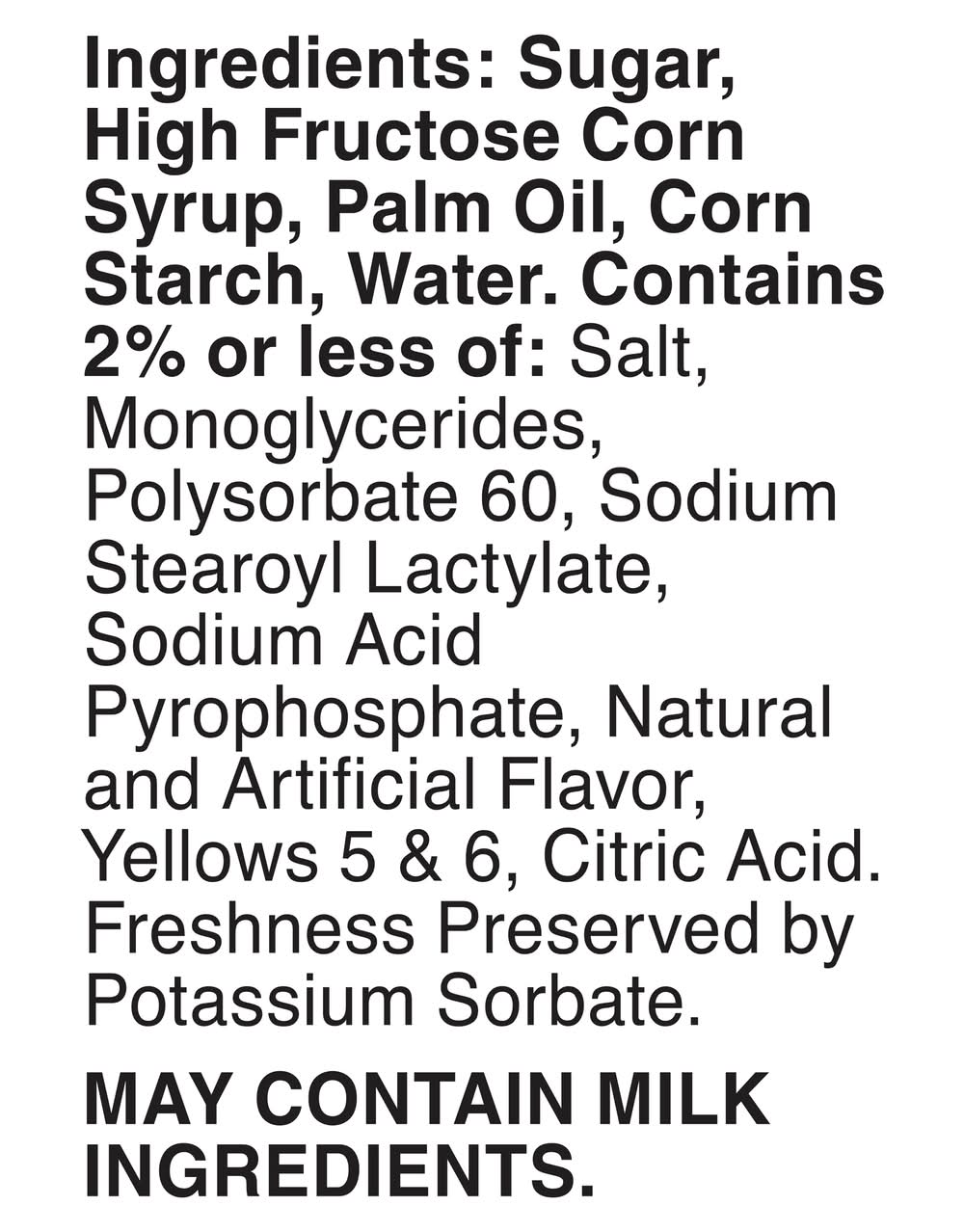 Ingredients: Sugar, High Fructose Corn Syrup, Palm Oil, Corn Starch, Water, Contains 2% or Less of: Salt, Monoglycerides, Polysorbate 60, Sodium Stearoyl Lactylate, Sodium Acid Pyrophosphate, Natural and Artificial Flavor, Yellows 5 & 6, Citric Acid, Freshness Preserved by Potassium Sorbate Contains: Corn, Milk, Palm oil