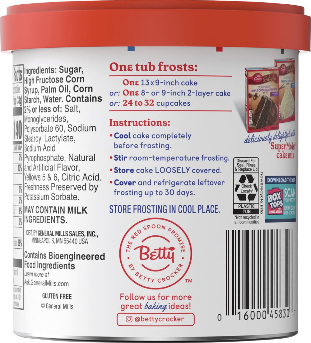 your cakes, cupcakes, and cookies for the whole family to enjoy. Just pop open the can, spread the frosting, and share! Beside the sweet vanilla taste and creamy texture, this gluten free frosting is a great pantry staple to keep on hand with your other baking supplies. With the help of Betty Crocker frosting, you're always ready to whip up something irresistible. For more than a century, • Flavor: Vanilla • Size: 16 OZ • Number of servings: 13 • Packaging: Reusable