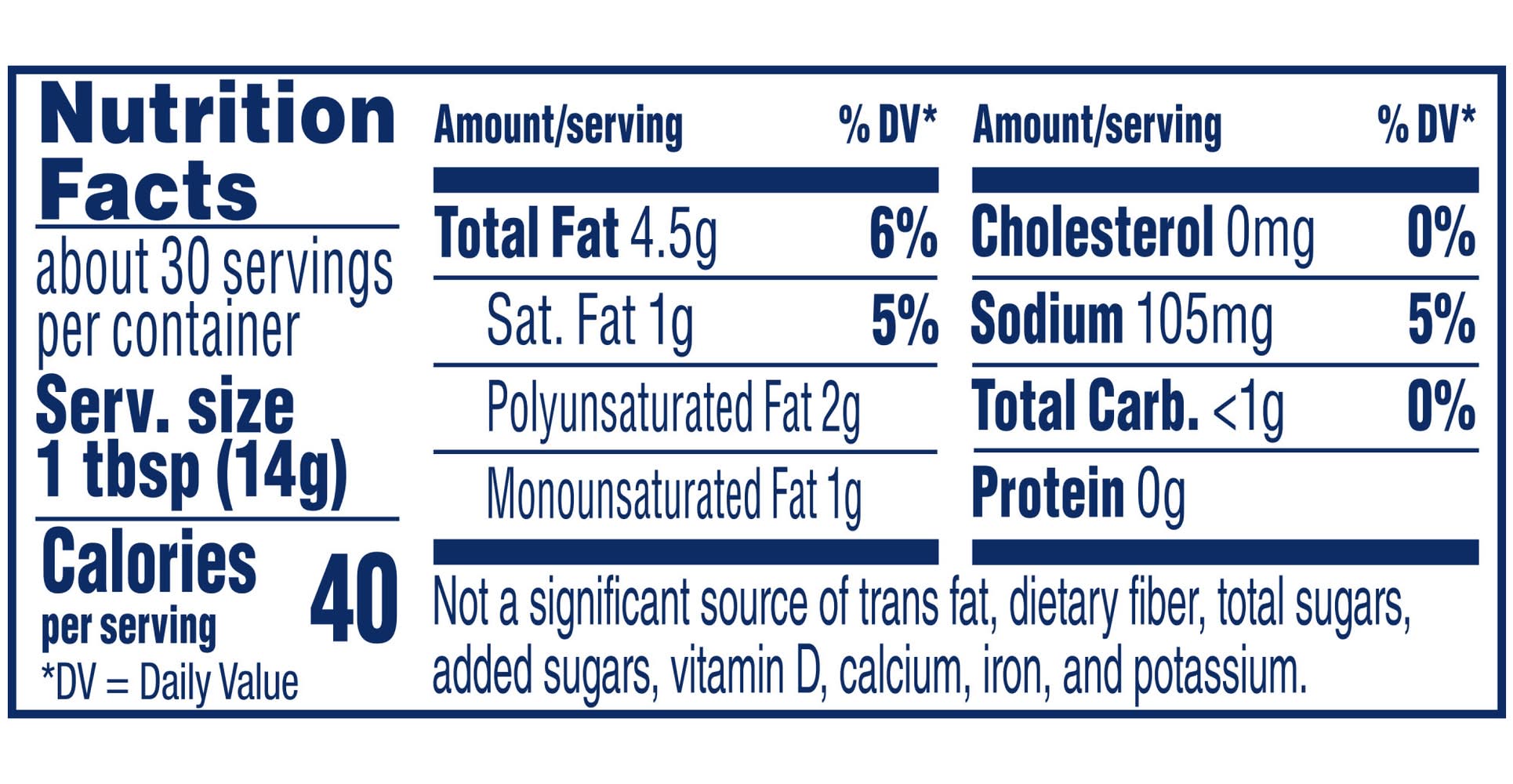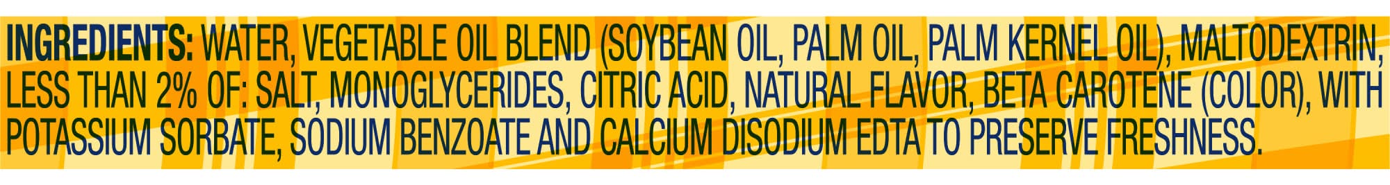 Ingredients: Vegetable Oil Blend (Soybean Oil Palm Oil and Palm Kernel Oil), Water, Salt, Less than 2% of: Emulsifiers (Mono- and Diglycerides Soy Lecithin), Whey, Preservatives (Potassium Sorbate and Sodium Benzoate), Phosphoric Acid (Acidulant), Natural and Artificial Flavor, Colored with Beta Carotene (Source of Vitamin A), Vitamin A Palmitate Contains: Milk, Soy