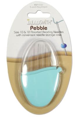 Pebbles are perfect for safely organizing beading needles. Quickly retrieve them from your crafting box to begin a fun project. This set comes in a handy vibrant sky blue storage case. Silver and turquoise. 4 needles. Includes case. Steel and plastic. 2 - size 10 needles 2 -size 12 needles.