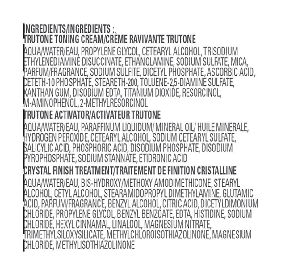 Ingredients: Trutone Toning Cream: Aqua/Water/Eau, Propylene Glycol, Cetearyl Alcohol, Trisodium Ethylenediamine Disuccinate, Ethanolamine, Sodium Sulfate, Mica, Parfum/Fragrance, Sodium Sulfite, Dicetyl Phosphate, Ascorbic Acid, Ceteth-10 Phosphate, Steareth-200, Toluene-2.5-Diamine Sulfate, Kanthan Gum, Disodium EDTA, Titanium Dioxide, Resorcinol, M-Aminophenol, 2-Methylresorcinol, Trutone Activator: Aqua/Water/Eau, Paraffinum Liquidum/Mineral Oil/Huile Minerale, Hydrogen Peroxide, Cetearyl Alcohol, Sodium Cetearyl Sulfate, Salicylic Acid, Phosphoric Acid, Disodium Phosphate, Disodium Pyrophosphate, Sodium Stannate, Etidronic Acid, Crystal Finish Treatment: Aqua/Water/Eau, Bis-Hydroxy/Methoxy Amodimethicone, Stearyl Alcohol, Cetyl Alcohol, Stearamidopropyl Dimethylamine, Glutamic Acid, Parfum/Fragrance, Benzyl Alcohol, Citric Acid, Dicetyldimonium Chloride, Propylene Glycol, Benzyl Benzoate, EDTA, Histidine, Sodium Chloride, Hexyl Cinnamal, Linalool, Magnesium Nitrate, Trimethylsiloxysilicate, Methylchloroisothiazolinone, Magnesium Chloride, Methyliso Thiazolinone Contains: Sulfites