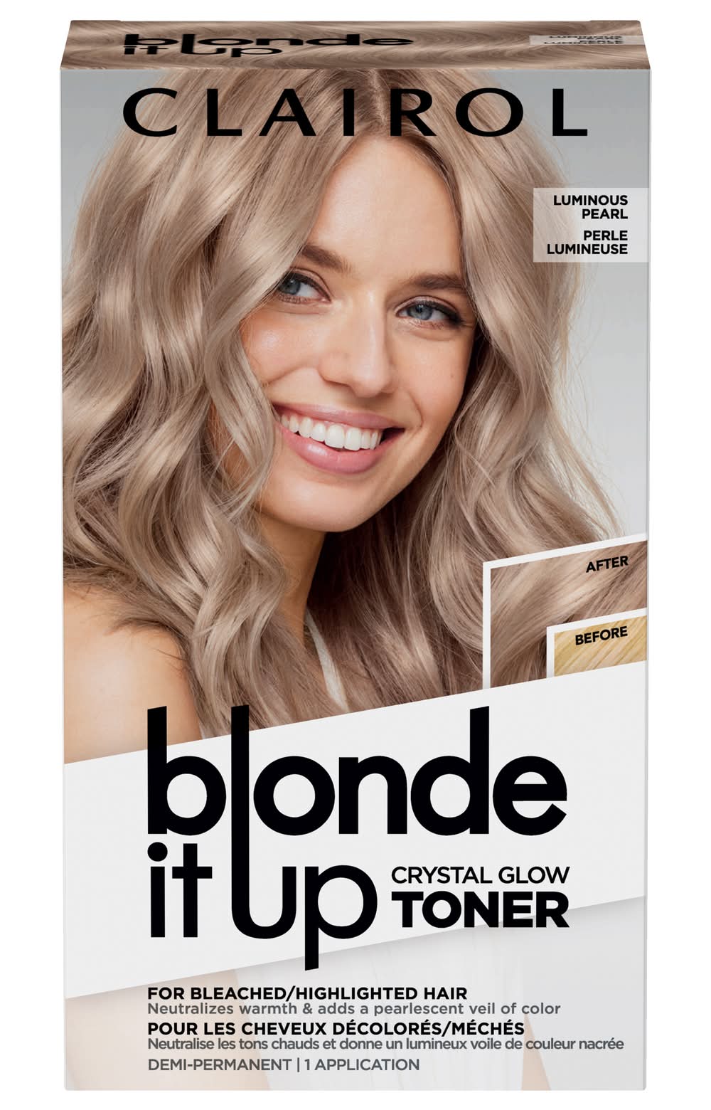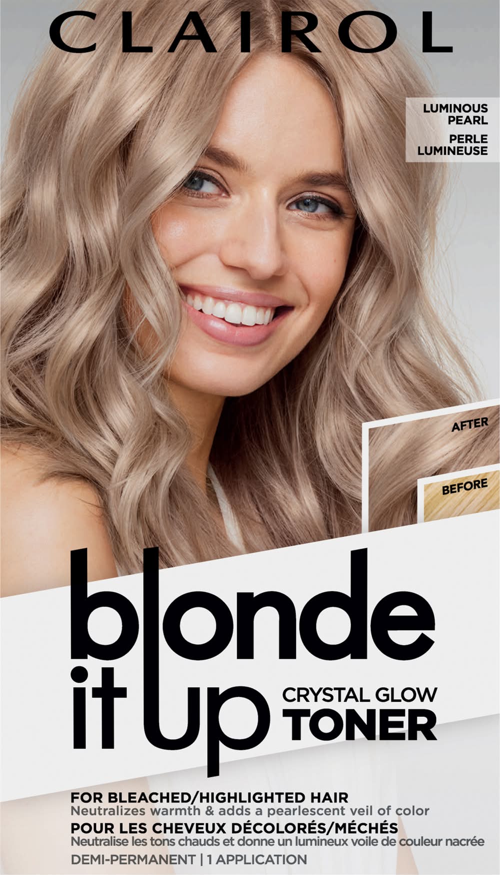 This Kit Contains: 1. TruTone Toning Cream. 2. TruTone Activator. 3. Crystal Finish Treatment. For bleached/highlighted hair. Neutralizes warmth & adds a pearlescent veil of color. Save to remember your shade. Soft hues with a big impact! Boost your blonde with sheer color and brilliant shine with our new 0% ammonia toners! This Luminous Pearl toner reduces brass and adds shimmering, pearlescent cool tones. You'll also get high-gloss shine that will magnify your blonde and leave your hair feeling incredibly smooth and conditioned. To top it off, the Crystal Finish Treatment adds even more luminous shine after toning. Bleached hair. Highlighted hair. Designed to be used on color-treated blondes, bleached blondes, natural light blondes, highlights and balayage - whether you colored at home or at the salon. Boost your blonde with brilliant, pearlescent tones! Our Trutone System with 0% ammonia, neutralizes unwanted warm tones, adds high-gloss shine, and a sheer veil of color for up to 3 weeks. Your blonde will be magnified and feel super smooth and conditioned. Ingredients are listed on the bottom of the box. www.Clairol.com. how2recycle.info. Want to know more? Scan to see the full shade collection, see more color results and learn how to use Blonde It Up! Questions? Call the Expert Color Consultants at 1-800-CLAIROL (1-800-252-4765), visit www.Clairol.com or search for Clairol on Facebook Messenger to chat with us! 100% recycled aluminum tube (95% post-consumer recycled (PCR) and 5% post-industry recycled (PIR). FSC: Mix - Packaging. Made in Mexico.