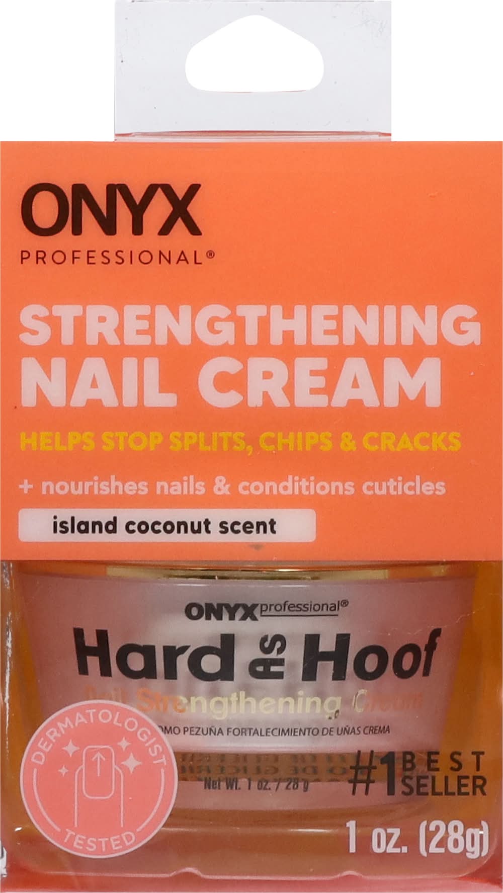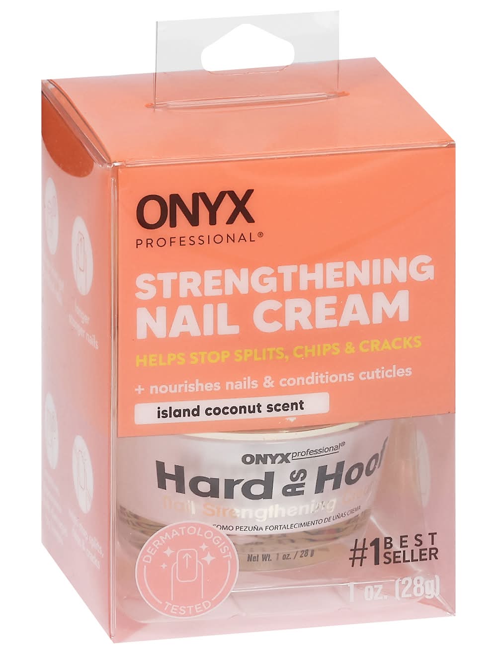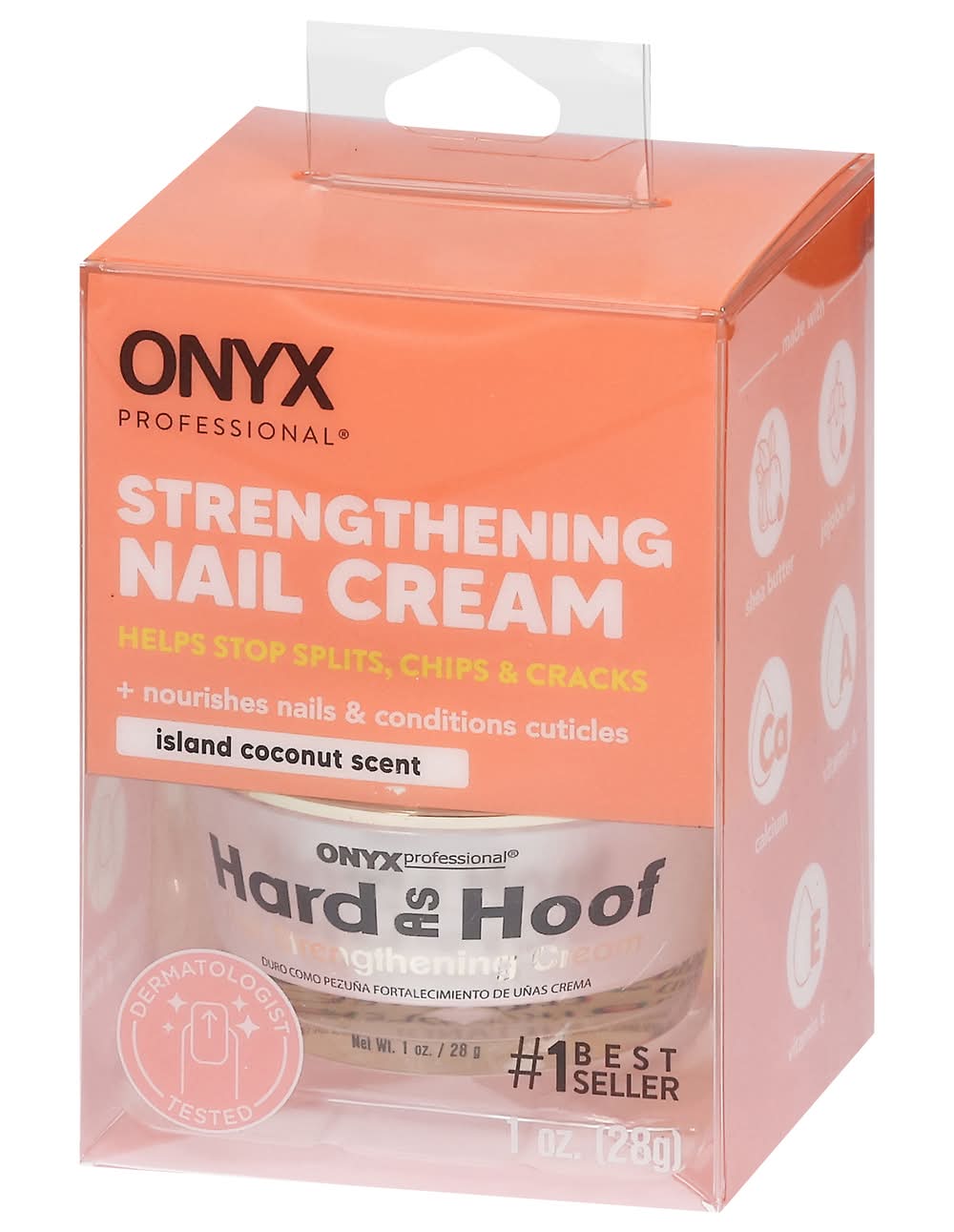 Strengthening. Helps stop splits, chips & cracks + nourishes nails & conditions cuticles. Hard as hoof. Dermatologist tested. No1 best seller. It's all fun and games until someone breaks a nail. Strengthens damaged nails after acrylic and gel. Help protect nails from drying, cracking or splitting with this shea butter, calcium, jojoba oil and vitamin A & E enriched formula. Aftercare from gel & artificial nails. Longer stronger nails. Improves appearance of nails damaged by fungus. Helps stop splits, chips & cracks. onxybrands.com. (501) 753-7676. onxybrands.com. Woman founded. Animal Test Free. PETA.