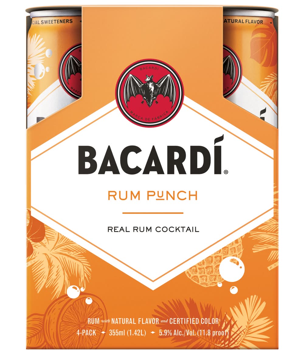 Bacardi Rum Punch Cocktail offers a ready-to-drink experience in a convenient four-pack of cans. Each can contains a blend of rum and fruit flavors crafted to deliver a tropical taste. Ideal for those looking to enjoy a crafted cocktail without the need for mixing or additional ingredients. • Alcohol by volume: 5.9% • Bacardi U.S.A, Inc.,