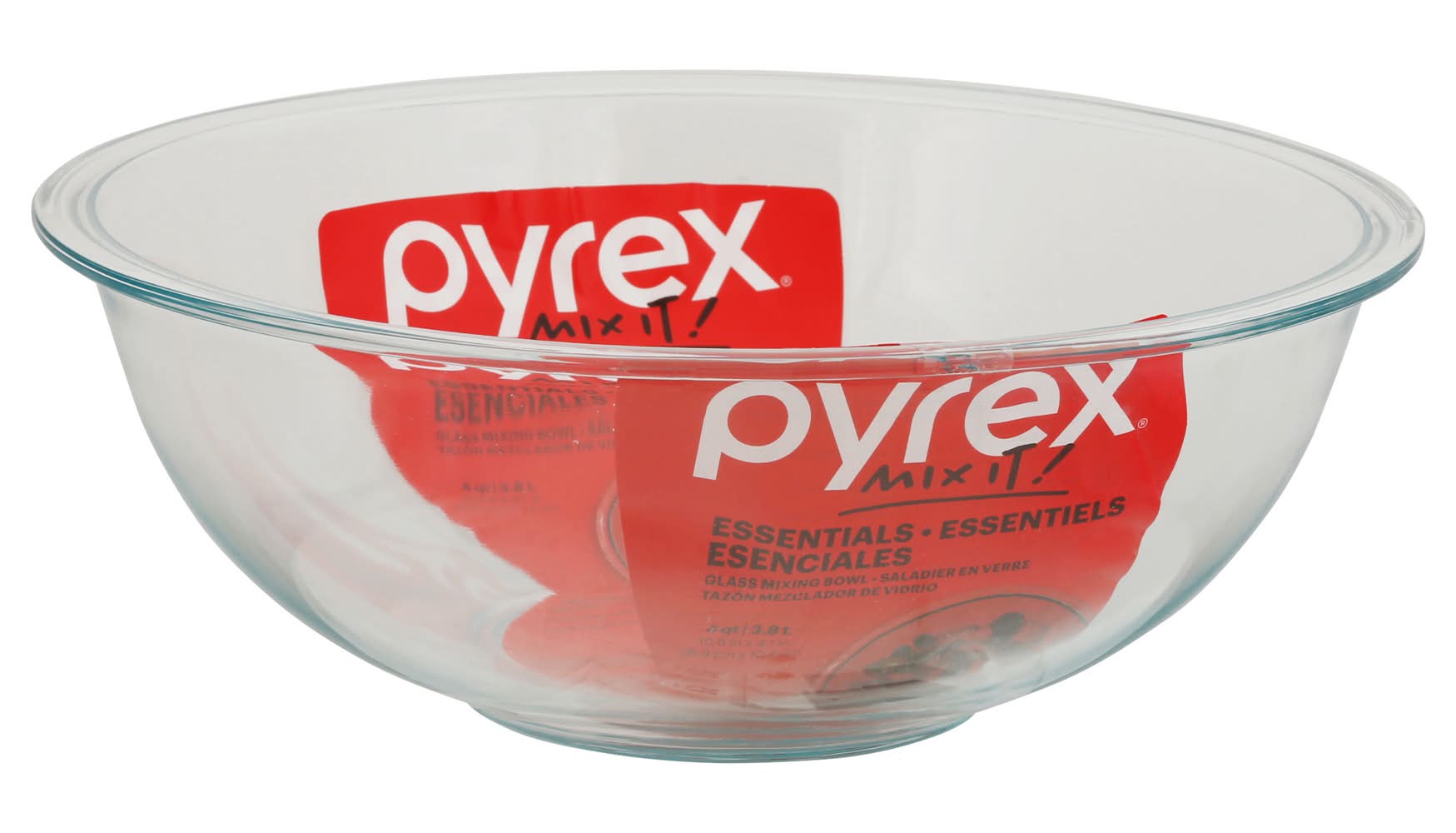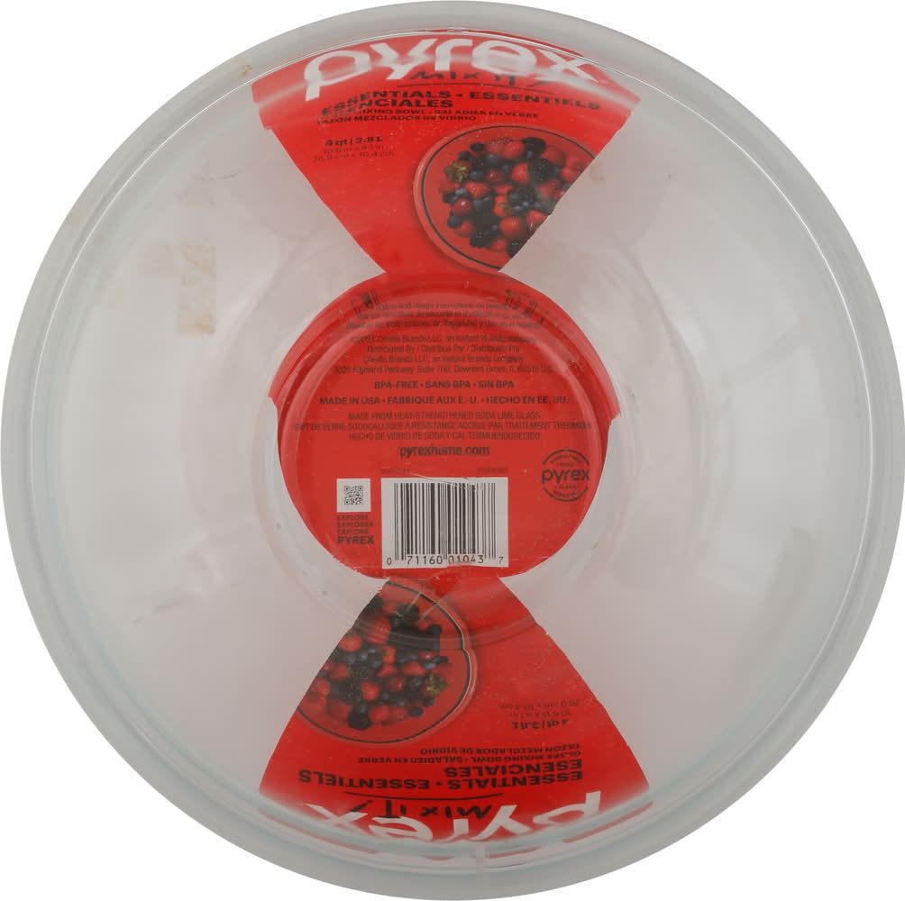 4 qt (3.8 l). Mix it! Essentials. Refrigerator & freezer safe. Microwave safe. Preheated oven - safe glass container. Dishwasher safe, lids top rack. Made from heat-strengthened soda lime glass. Limited two-year warranty: www.pyrexhome.com. www.pyrexhome.com. Explore. For more information visit www.Pyrexwave.com. BPA free. Made in USA. World Kitchen,