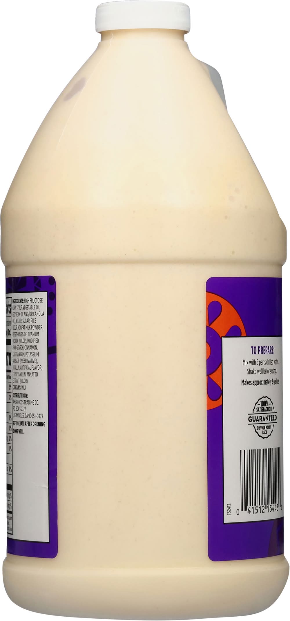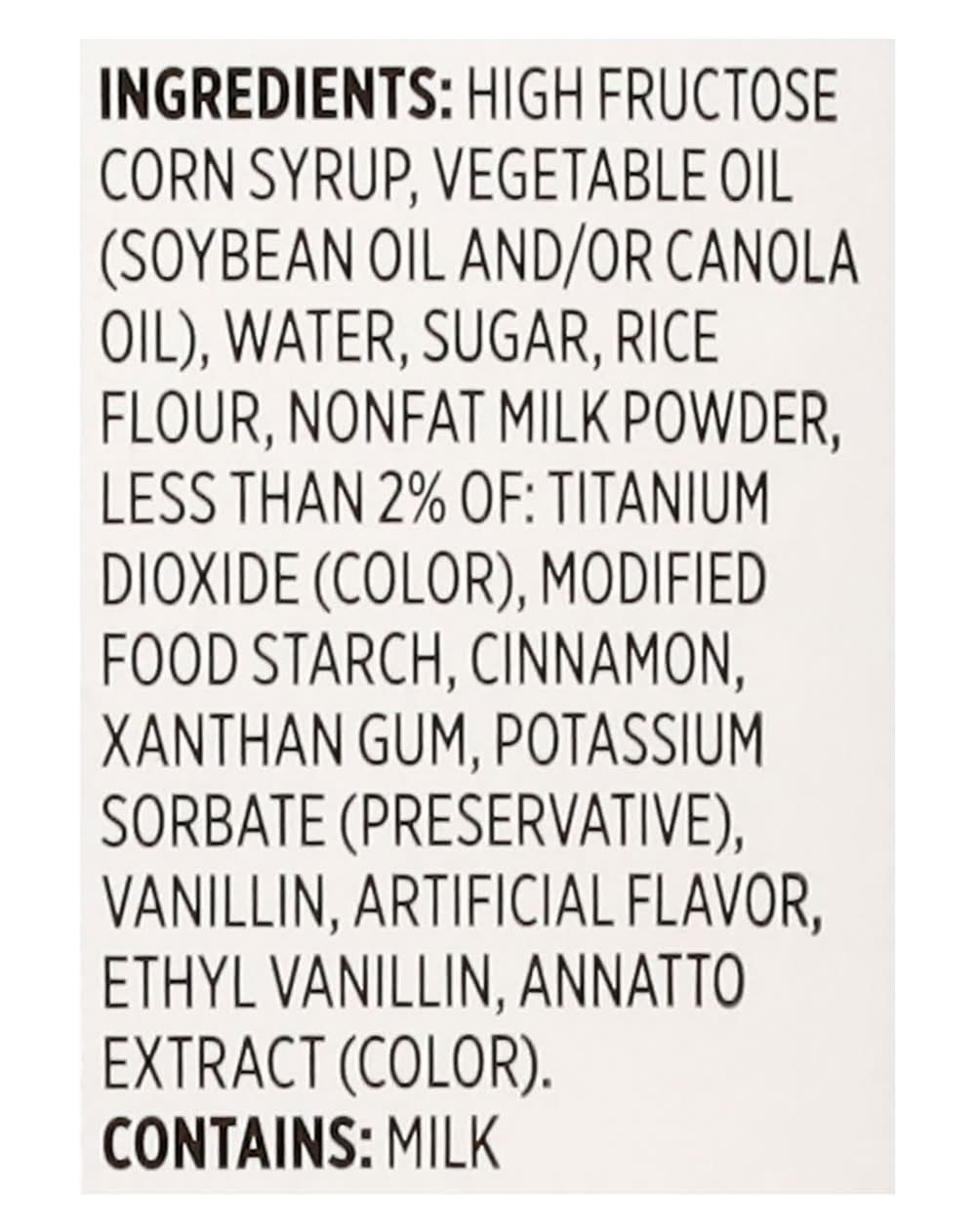 High Fructose Corn Syrup, Vegetable Oil (Soybean Oil and/or Canola Oil), Water, Sugar, Rice Flour, Nonfat Milk Powder, Less than 2% of: Titanium Dioxide (Color), Modified Food Starch, Cinnamon, Xanthan Gum, Potassium Sorbate (Preservative), Vanillin, Artificial Flavor, Ethyl Vanillin, Annatto Extract (Color) Contains: Milk, Soybeans