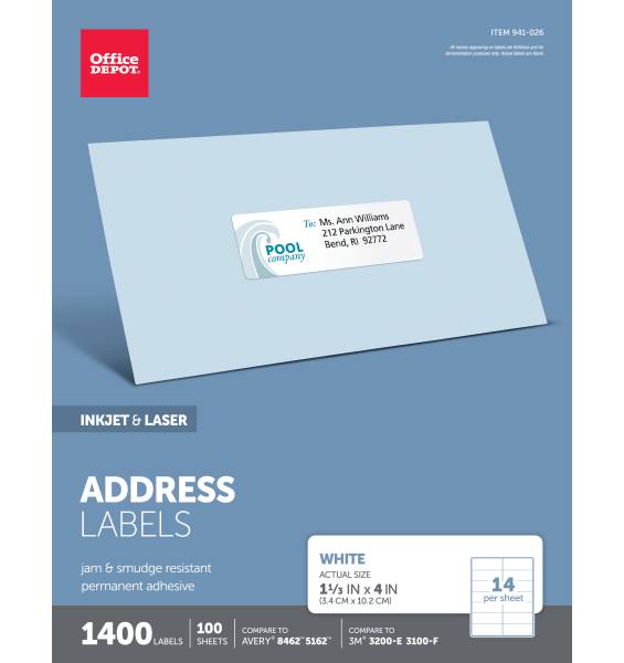 Office Depot Inkjet or Laser Address Labels, 1 1/3 x 4 in, White (1400 ct)