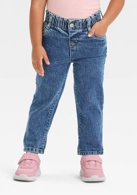 Cat & Jack Mid Rise Elastic Waistband Toddler Girl's Paperbag Denim Pants, 18M, Dark Wash