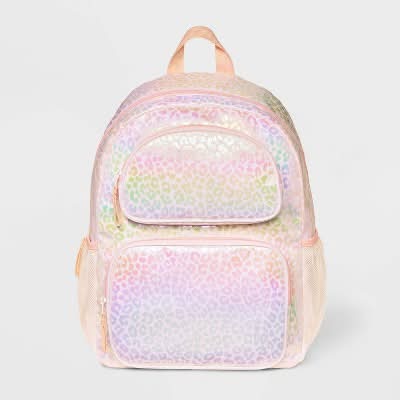 Cat & Jack Leopard Two Pocket Backpack, 16", Iridescent White/Pink