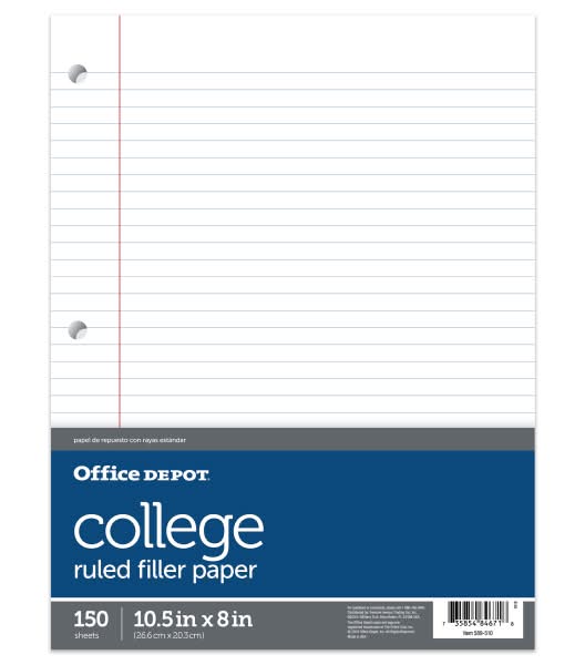 Office Depot College Ruled Notebook Filler Paper 150 Sheets, 10.5x8 in, White
