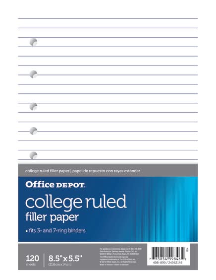 Office Depot 120 College-Ruled Notebook Filler Paper, 8.5" x 5.5", White