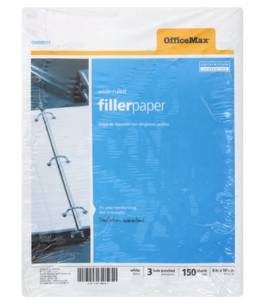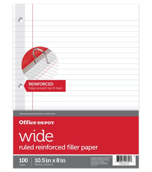 Office Depot Wide Ruled Reinforced Filler Paper, 8" x 10-1/2", White (100 ct)