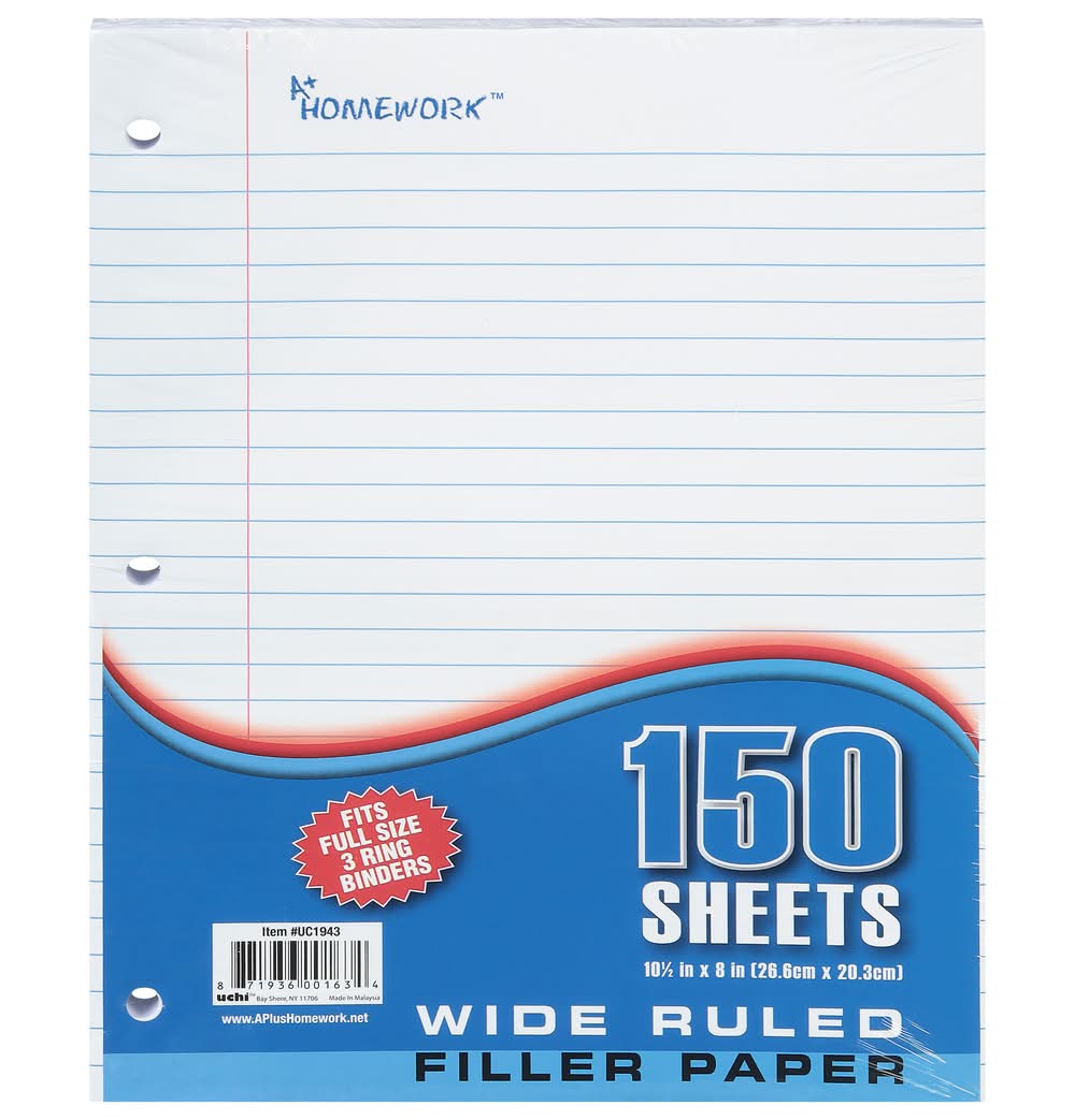 A+Homework Wide Ruled Filler Paper, 3 Ring Binders, White (150 ct)