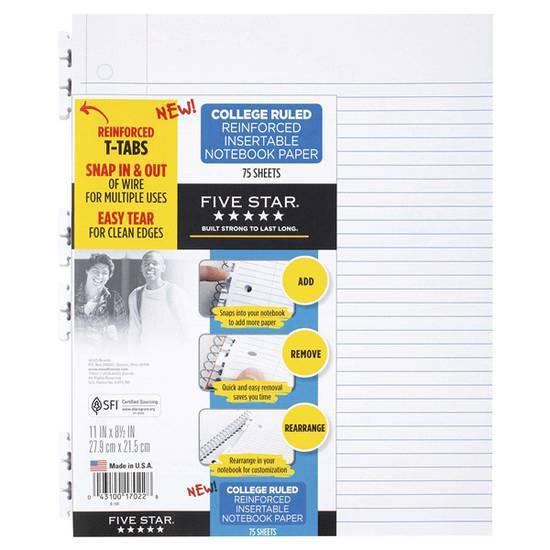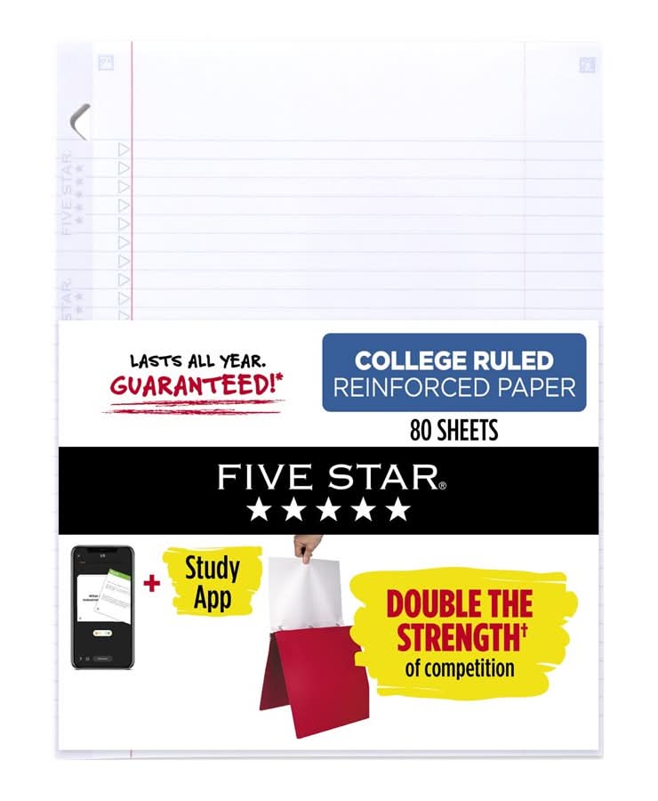 Five Star College Ruled Reinforced Loose Leaf Filler Paper 80 Sheets, 8.5x11 in, White