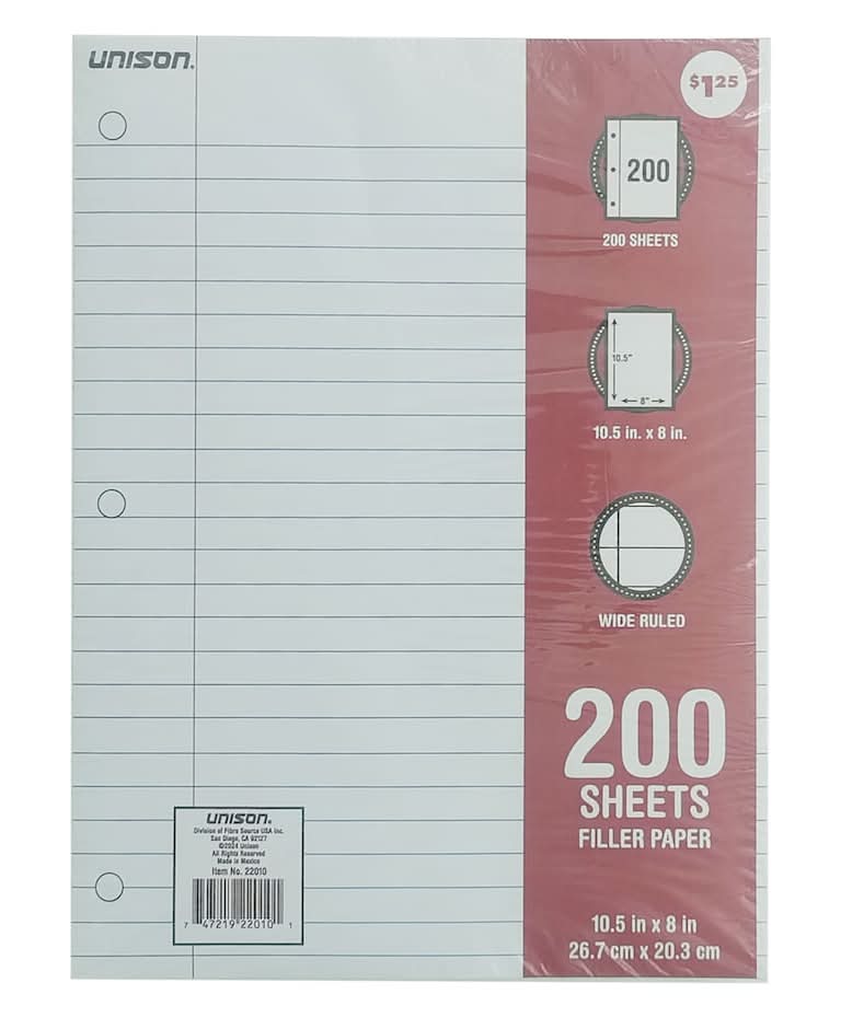 Unison Lined Wide Ruled Filler Paper 200 Sheets, 10.5x8 in