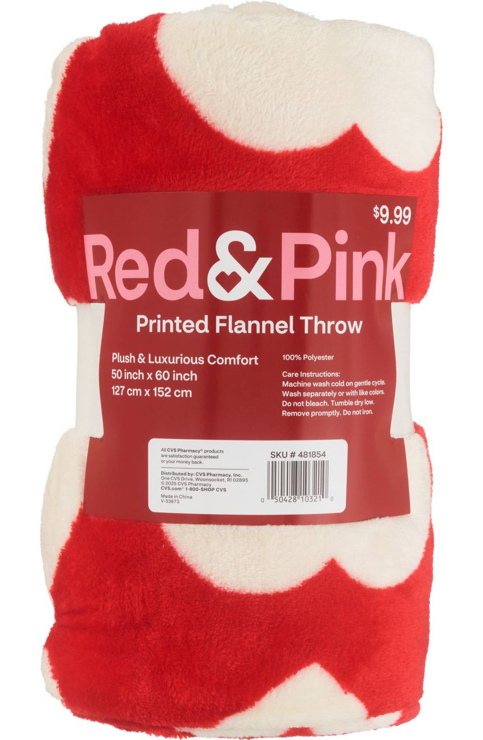 Red & Pink White Hearts Printed Flannel Throw, 50 x 60 in