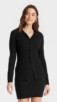 A New Day Ribbed Cuff & Hem Polo Collar Button Down Cardigan, Women, XS, Black