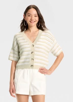 Universal Thread Short Sleeve Button Front Cardigan, Women, XS, Cream Striped