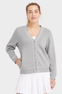 All In Motion Piped Button-Up Cardigan, Women, S, Heathered Gray