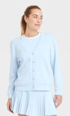 All In Motion Piped Button-Up Cardigan Deep V Neck Relaxed Fit, Women, L, Sky Blue