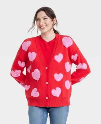 33 Degrees Women's Valentine's Day Pink Hearts Graphic Cardigan, S, Red