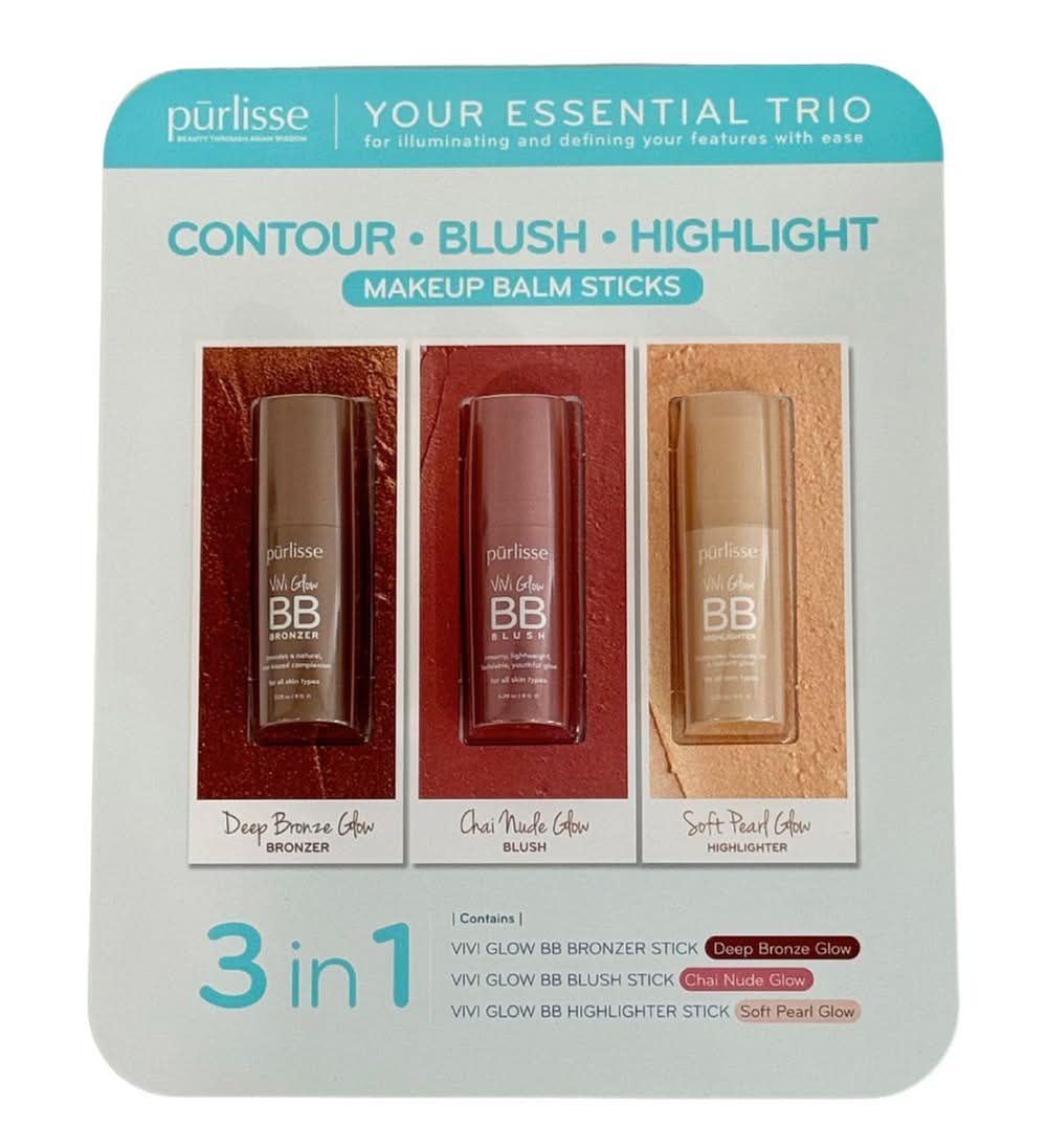 purlisse Contour Makeup Balm Sticks Trio, Deep Bronze Glow-Chai Nude Glow-Soft Pearl Glow (0.84 oz, 3 ct)