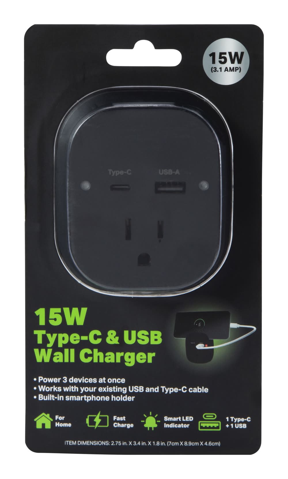 Five Below Usb-C & Usb Wall Charger With Outlet 15w, Black