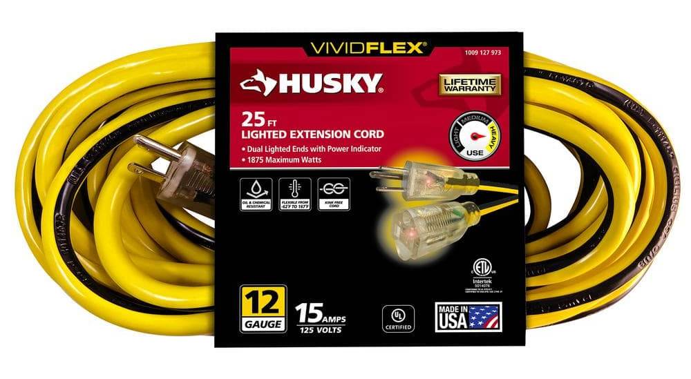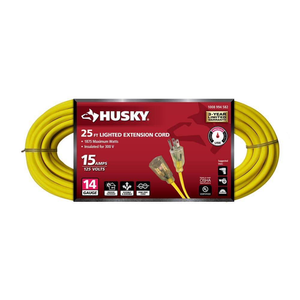 Husky Heavy Duty Indoor Outdoor Extension Cord With Lighted End, 25 ft, Yellow