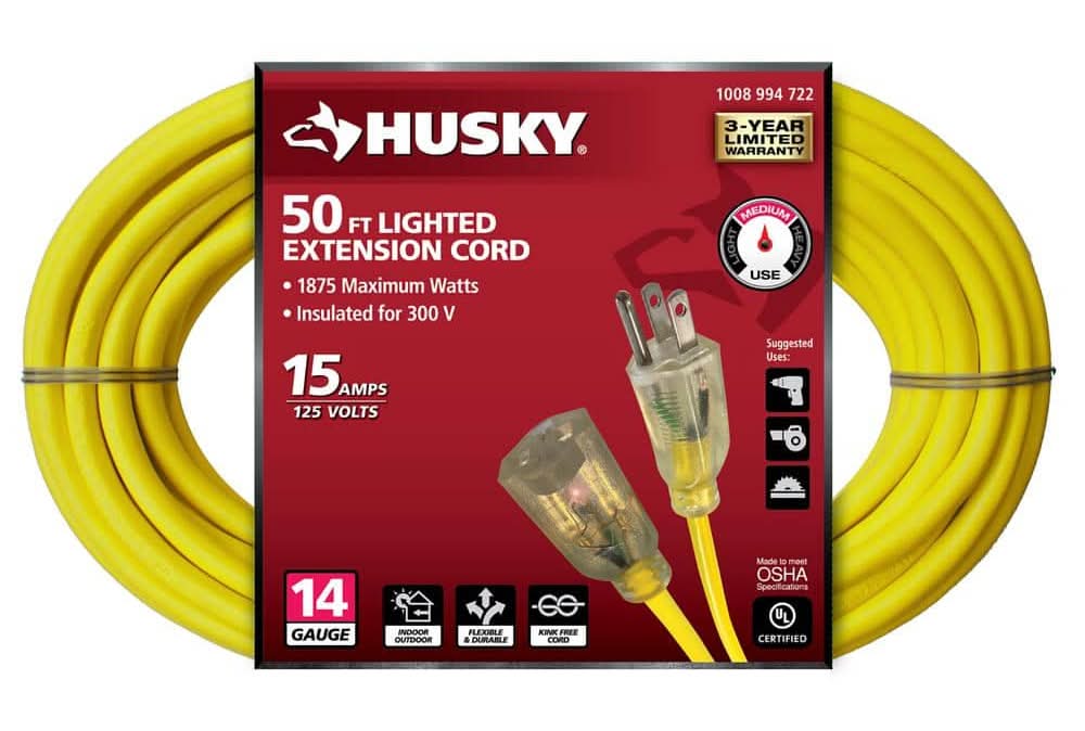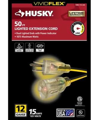 Husky Lighted Extension Cord 12 Gauge 15 Amp 125 V, 50 ft, Yellow