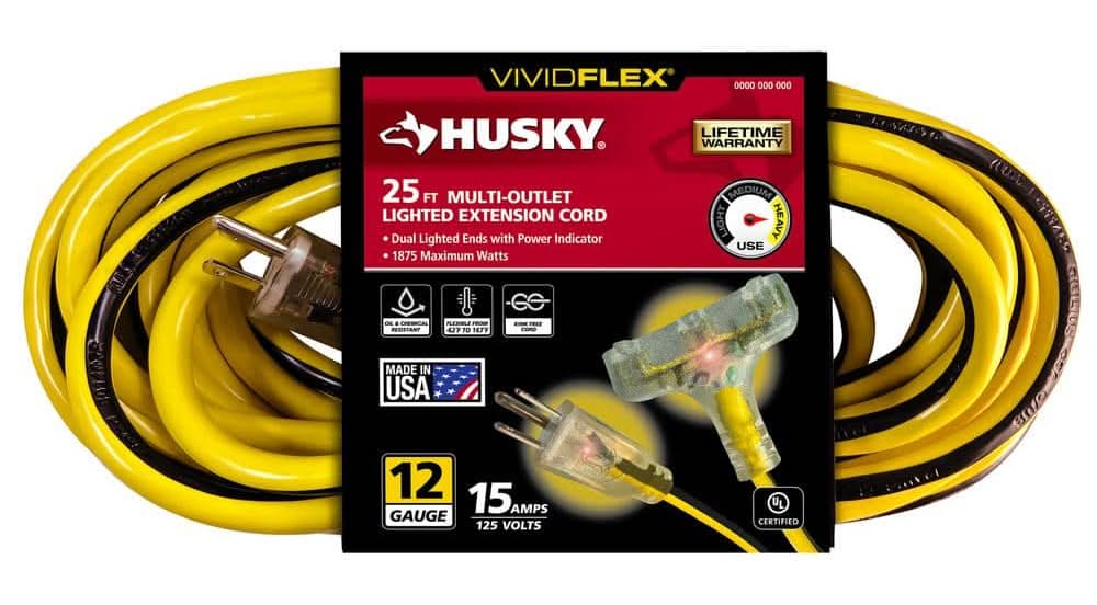 Husky Vividflex Multi-Outlet Lighted Extension Cord, 25 ft, Yellow