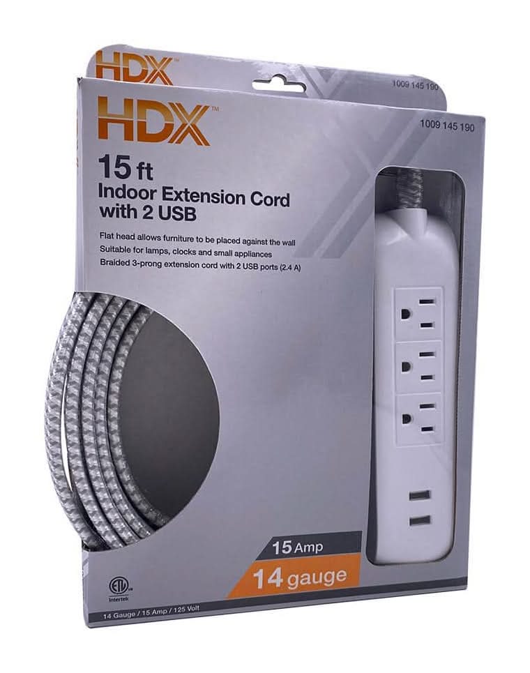 HDX Indoor Extension Cord With 2 Usb-A and 3 Outlets, 15 Ft, Grey - White