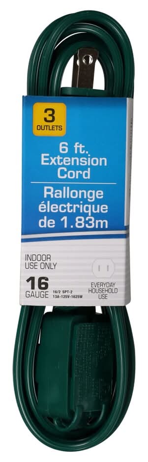 16 Gauge Extension Cord For Indoor Use 3 Outlets, 6 ft, Green