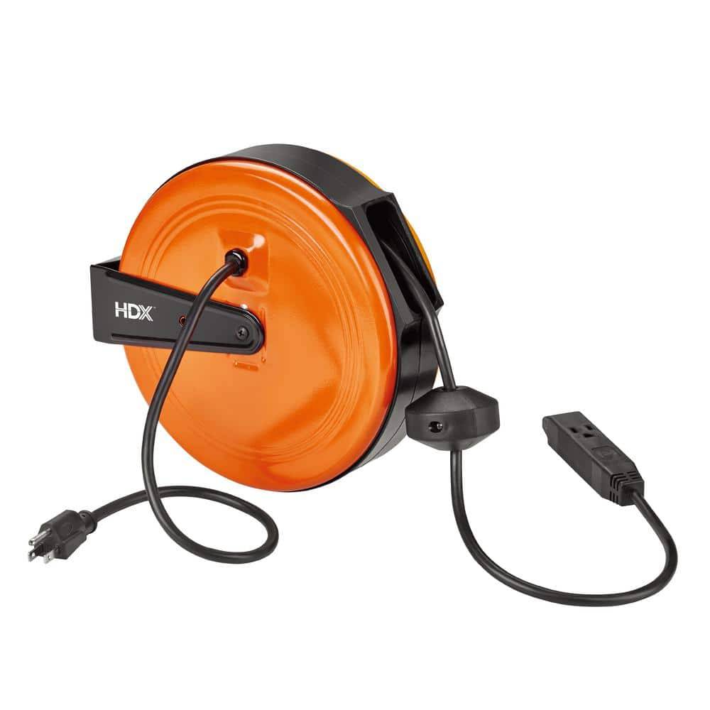HDX Retractable Cord Reel With 3 Grounded Outlets, 30ft, Orange-Black